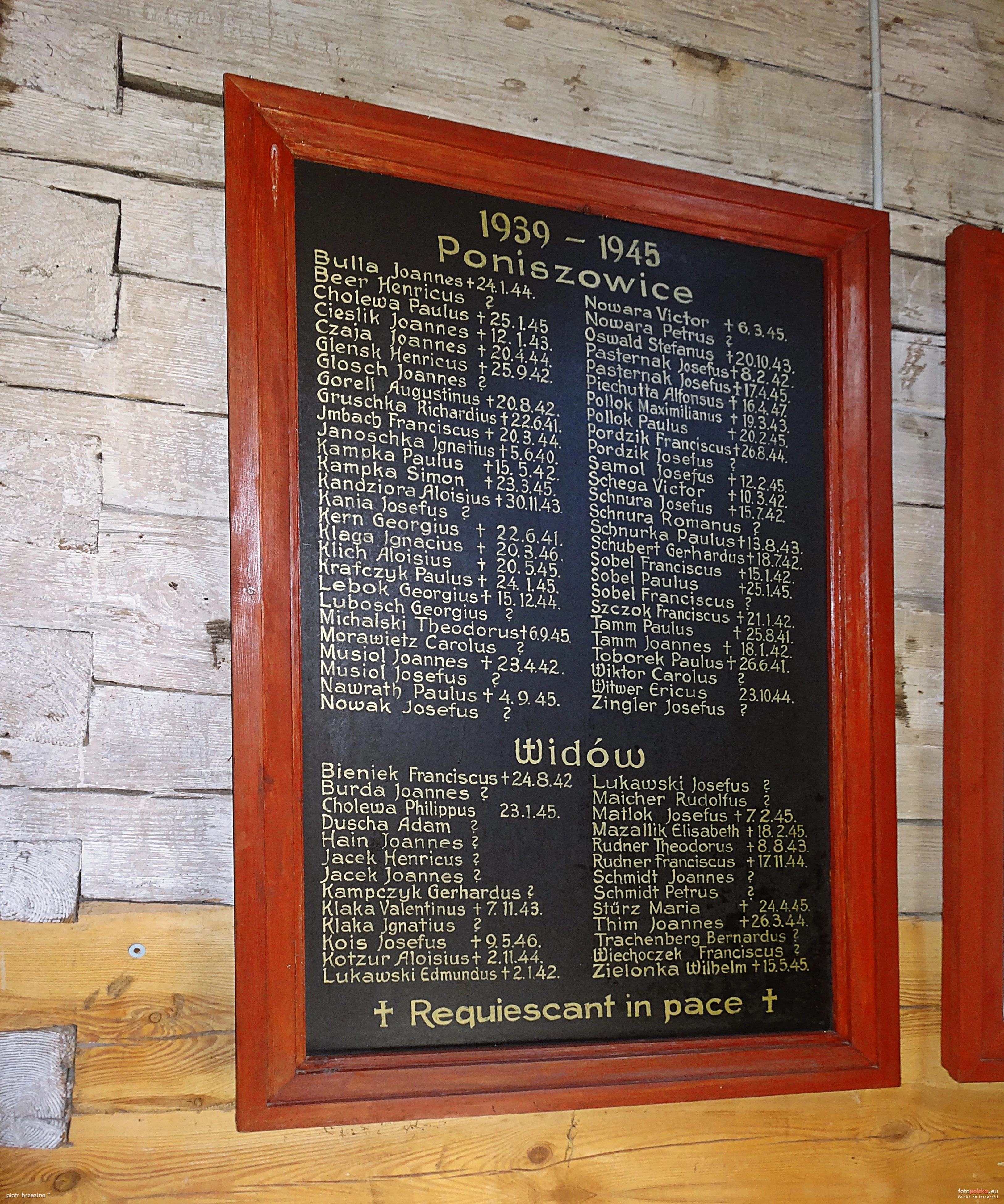 0 pobrań 460 odsłon 6 średnia ocen Poprzednie i następne zdjęcia piotr brzezina Obiekty widoczne na zdjęciu Wnętrze więcej zdjęć (19) Kościół św. Jana Chrzciciela więcej zdjęć (45) Zbudowano: 1404 Zabytek: A/305/50 z 2.05.1950; A/356/60 z 10.03.1960 Kościół par. p.w. św. Jana Chrzciciela. W świetle akt wizytacyjnych z XVII w., kronik i innych dokumentów, parafia powstała w 1175 r. Pod względem terytorialnym nie uległa zmianie w ciągu dziejów. Początkowo była najprawdopodobniej filią parafii Ujazd. W 1399 roku silna wichura zniszczyła główną nawę kościoła. Do roku 1404 został odbudowany, przy tej okazji został też powiększony. Niezmienione zostało prezbiterium. Taki kościół przetrwał do dzisiejszego dnia. Konsekracji odbudowanego kościoła dokonano 11 października 1499 roku. Kościół jest orientowany, drewniany (z modrzewia), konstrukcji zrębowej na podmurówce kamiennej. Usytuowany na wzgórzu, otoczony murem z kamienia. Oddzielną dzwonnicę zbudowano w roku 1520. Akta wizytacyjne z 1679 r. wymieniają trzy ołtarze drewniane, bogato złocone. Ołtarz główny jest pod wezwaniem św. Jana Chrzciciela. Obecnie w głównym ołtarzu znajduje się obraz Matki Boskiej Częstochowskiej, przyniesiony z Częstochowy w 1860 r. jako wotum wdzięczności parafian za wysłuchane prośby w czasie zarazy i głodu. Obok umieszczony jest również obraz Narodzenia św. Jana Chrzciciela z 1700 r. W latach 1982-84 ołtarze zostały gruntownie odnowione przez konserwatorów Kazimierę i Kazimierza Rajdów z Krakowa; przywrócono wtedy ich pierwotny stan z XVII w. Najstarszy dzwon o imieniu "Słowo Pańskie" (o wadze 200 kg), pochodzi z 1536 r. W miejsce zabranych w czasie działań wojennych (w1942 r.) dwóch innych dzwonów, parafianie ufundowali trzy nowe dzwony spiżowe: św. Jana Chrzciciela (o wadze 600 kg), Matki Bożej Częstochowskiej (o wadze 400 kg) i św. Józefa (o wadze 500 kg). Według najstarszych kronik Parafii Poniszowice powstała w1175. W tym roku wybudowano też kościół pod wezwaniem Jana Chrzciciela z drzewa (modrzew). Zachowały się księgi metrykalne chrztów od 1706 roku, pozostałe od 1766 roku. Również zachowały się niektóre protokoły wizytacyjne z XVIII i XIX wieku. A także z tego okresu kronika parafialna własnoręcznie pisana przez ówczesnych Proboszczów: żródło: - FM ul. Cicha więcej zdjęć (85) |