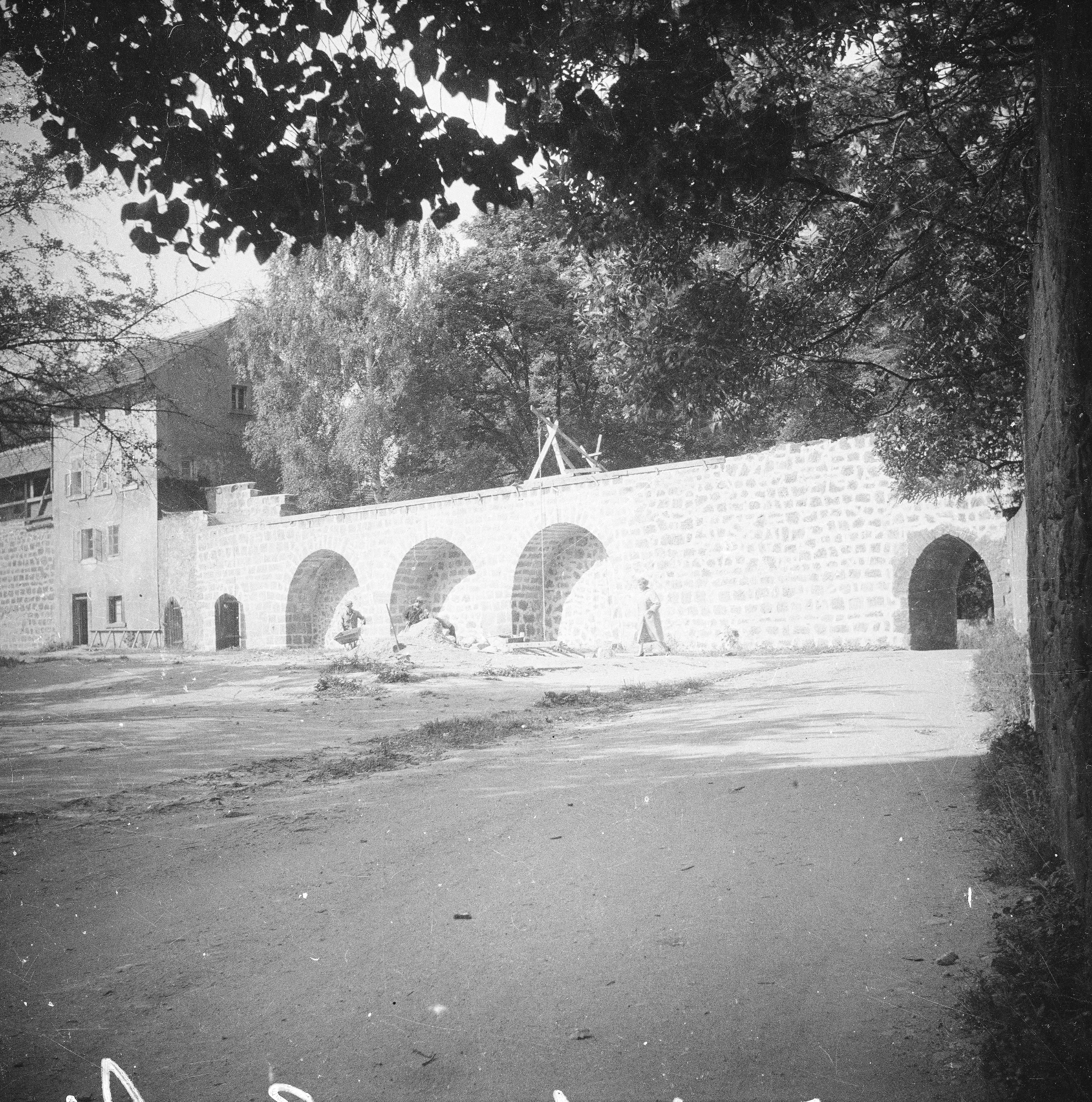 Lata 1956-1960 , Fragment średniowiecznych murów miejskich wzdłuż ul. Kościelnej w czasie konserwacji. Z lewej baszta przy ul. Kościelnej 31, z prawej brama na ul. Murarską.Skomentuj zdjęcie |