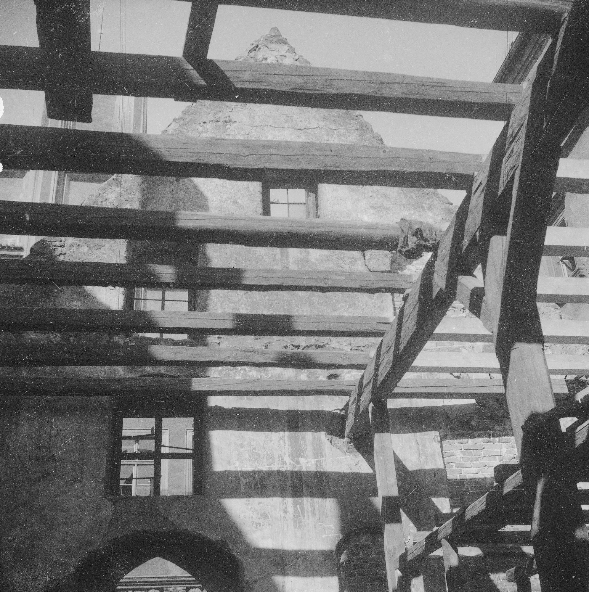 Lata 1945-1960 , Ściana szczytowa remontowanej kamienicy Ław Chlebowych i Obuwniczych przy pl. Wolności 21 - widok z wnętrza. Widoczne belki stropowe. W oddali z lewej widoczny fragment szczytu schodkowego ratusza.Skomentuj zdjęcie |