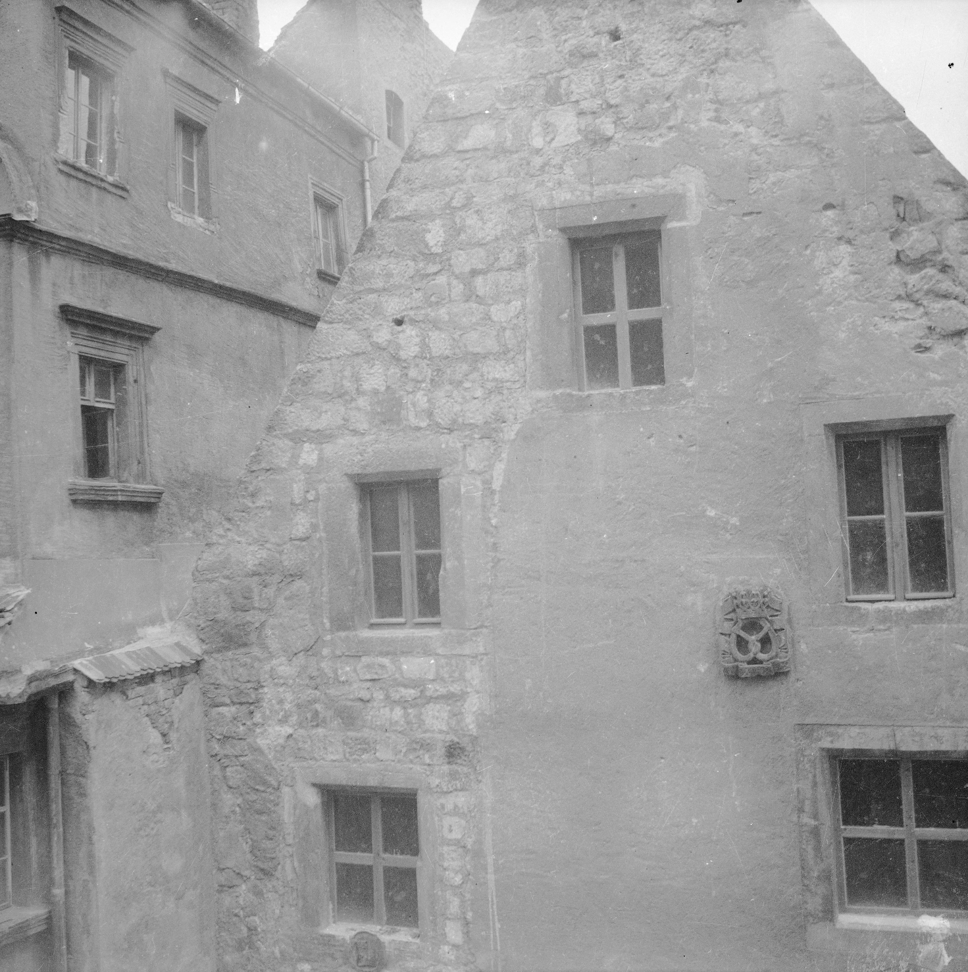 Lata 1955-1960 , Front Kamienicy Ław Chlebowych i Obuwniczych przy pl. Wolności 21 z widocznym emblematem cechu piekarzy - widok z okna wschodniej elewacji ratusza. Z lewej fragment kamienicy pod nr 22.Skomentuj zdjęcie |
