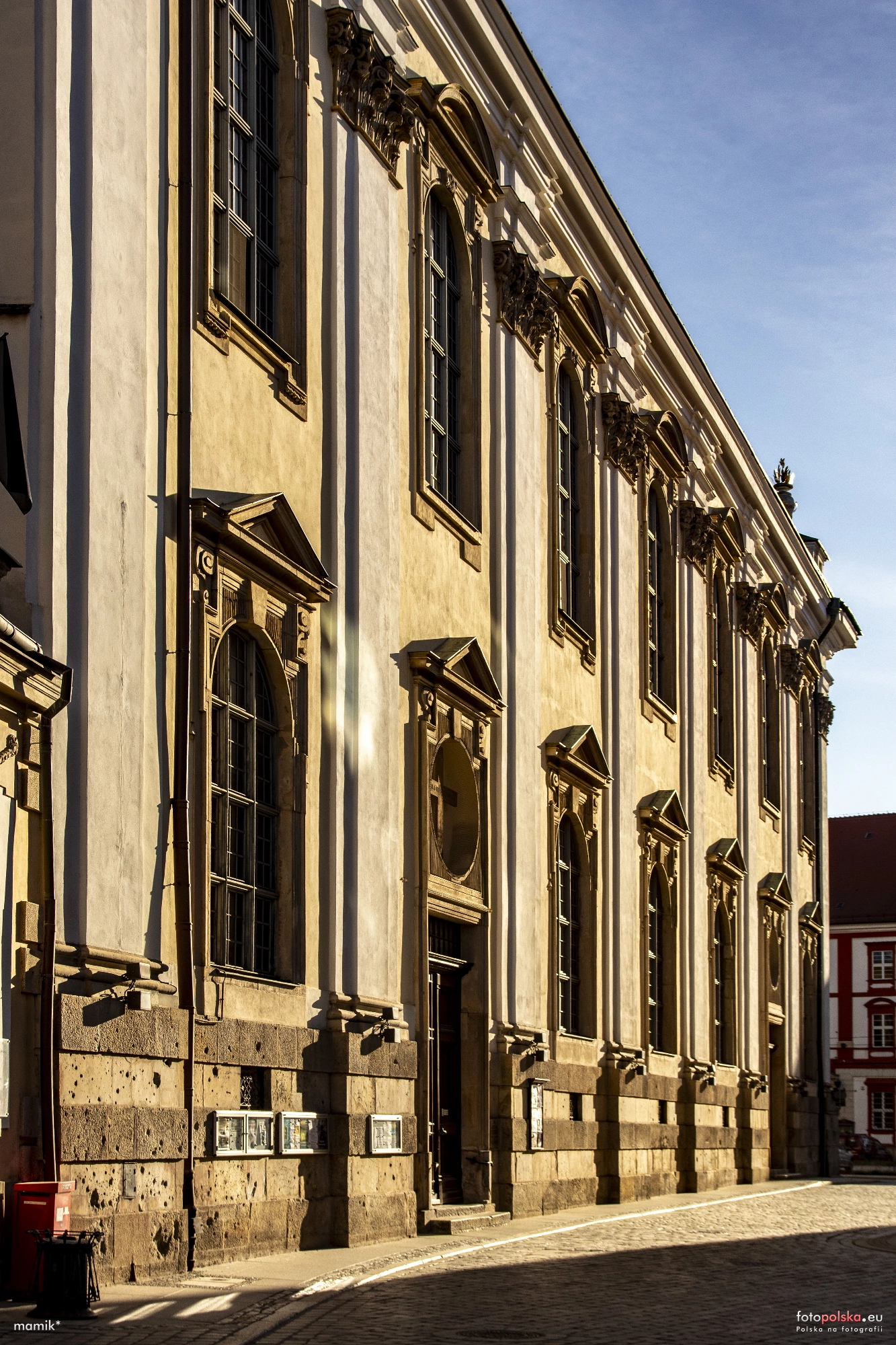 Kościół Najświętszego Imienia Jezus (Kościół Uniwersytecki) więcej zdjęć (75) Architekt: Johann Georg Knoll Atrakcja turystyczna Zbudowano: 1689-98 Dawniej: Kościół św. Macieja Zabytek: 9 z 26.11.1947 oraz 85 z 6.02.1962 Świątynię zbudowali jezuici w latach 1689 – 1698, a prace nad jej wyposażeniem i dekoracją trwały jeszcze przez kolejne niemal 40 lat, aż do końca 1734 roku. ARCHITEKTURA ZEWNĘTRZNA. Architektura zewnętrzna kościoła jest zwarta, jednolita i bardzo oszczędna w użyciu form. Kościół został zorientowany, tzn. posiada prezbiterium od strony wschodniej. Gdy powstawał należał do budowli nowoczesnych, jasnych, z dużymi oknami i bogatym, jednolicie opracowanym wystrojem. W zwieńczeniu wschodniej elewacji znajduje się wykonany ze złoconej miedzi znak jezuitów – IHS w płomieniach glorii, nad nawą dwukondygnacyjna sygnaturka. ARCHITEKTURA WNĘTRZA. We wnętrzu harmonijnie połączono architekturę, malarstwo oraz rzeźbę monumentalną. W dekoracji ścian, filarów, pilastrów, ołtarzy zastosowano jako imitację kamienia barwiony gips – tzw. stucco lustro, dzięki któremu rzeźby sprawiają wrażenie wykutych z białego marmuru. Głowice kolumn, gzymsy, ramy obrazów są pozłacane złotem płatkowym. Szczególną rolę pełni w tym kościele jego naturalne oświetlenie. POLICHROMIE. Autorem malowideł o wyjątkowej randze artystycznej był nadworny malarz cesarski, wybitny wiedeński twórca Johann Michael Rottmayer von Rosenbrunn. Dekorował on m.in. tak prestiżowe fundacje sakralne jak kościół Świętej Trójcy w Salzburgu czy kościół św. Karola Boromeusza w Wiedniu. Posługując się techniką fresku mokrego (al fresco) komponował monumentalne malowidła iluzjonistyczne. PREZBITERIUM. Wypełniający szczelnie całą ścianę wschodnią kościoła monumentalny ołtarz główny z 1726 roku zaprojektował artysta – jezuita Christoph Tausch, który wykonał także malowidło w jego centralnej części, przedstawiające scenę obrzezania Dzieciątka Jezus w świątyni. Scena ta, zgodnie z opisem Ewangelii św. Łukasza (Łk 2, 21), mająca miejsce 8 dni po narodzinach Mesjasza, wiązała się z nadaniem mu imienia Jezus i jako taka spina cały bogaty program teologiczny wnętrza, związany z Najświętszym Imieniem Jezus. Obraz, namalowany na płótnie o wymiarach ok. 7 na 3,5 metra, w centralnej części ukazuje arcykapłana dokonującego aktu obrzezania. Towarzyszą mu po bokach Maryja i Józef, a górnej partii malowidła, wśród obłoków widoczna jest postać błogosławiącego Boga Ojca w otoczeniu chórów anielskich. W jednym z mężczyzn, będących świadkami ceremonii – chodzi o diakona ubranego w komżę i podającego nóż arcykapłanowi – możemy dopatrzyć się kryptoportretu autora obrazu Christopha Tauscha. W zwieńczeniu ołtarza dostrzec można postacie anielskie adorujące symboliczne przedstawienie Imienia Jezus – IHS. Pomiędzy kolumnami umieszczono dwie duże rzeźby. Po lewej stronie postać kobieca z kielichem i księgą, z napisem Terrestrum symbolizuje Kościół Triumfujący. Adorująca ją postać z kulą ziemską w dłoni obrazuje całą społeczność katolicką Śląska. Śląsk po łacinie to Silesia (rodzaj żeński), stąd postać ta jest kobietą. Niektórzy historycy utożsamiają ją z Karoliną – ostatnią z rodu Piastów, która zmarła w 1711 roku po zmianie wyznania z kalwińskiego na katolickie. Po prawej stronie, z napisem Infernorum kobieta z krzyżem i wzniesioną ręką, przedstawia Kościół Walczący. Postać pochylona jest nad upadającym człowiekiem symbolizującym herezję bądź istoty podziemne. Ołtarz ten należy do typowych przedstawień zgodnych z myślą Soboru Trydenckiego, o silnej wymowie kontrreformacyjnej. NAWA. Pomiędzy nawą a prezbiterium znajdują się dwie umieszczone po bokach duże figury. Rzeźba po stronie północnej – z lewej strony przedstawia postać św. Ignacego Loyoli – założyciela zakonu jezuitów, z siedzącym u jego stóp chłopcem, symbolizującym młodość świętego. Rzeźba po stronie południowej – z prawej strony przedstawia postać św. Franciszka Ksawerego – apostoła Indii, który chrzci młodego Hindusa. Nad tymi figurami, na gzymsach dźwigających łuk tęczowy, znajdują się figury aniołów. Anioł z lewej strony rzuca ogniste płomienie, z prawej trzyma kadzielnicę. SKLEPIENIE. W centralnej części sklepienia nawy znajduje się ogromna kompozycja, przedstawiająca adorację Najświętszego Imienia Jezus przez postacie z Nowego Testamentu, świętych i założycieli zakonu jezuitów oraz ludy czterech znanych wtedy kontynentów. W centrum, na tle otwartego nieba ukazano złoty rydwan ozdobiony napisem IHS w glorii (pierwsze trzy litery greckiego imienia Jezus, godło zakonu jezuitów, którego znaczenie w tradycji Kościoła odczytywane jest także jako skrót zawołania Iesus Hominum Salvator – Jezus Zbawiciel Ludzi), ciągnięty przez symbole czterech ewangelistów: woła, lwa, orła oraz uskrzydloną postać ludzką. Na rydwanie stoi Dzieciątko Jezus, ukazane z symbolami zmartwychwstania. Adorują je zastępy świętych i apostołów skupionych wokół Maryi, ukazanej jako orędowniczka, oraz liczne grono jezuitów, m.in. założyciele zakonu święci Ignacy Loyola i Franciszek Ksawery. Wokół tego malowidła możemy zobaczyć iluzjonistycznie namalowaną balustradę, za którą stoją współczesne artyście postacie, reprezentujące ludy czterech kontynentów: Europy, Azji, Afryki i Ameryki (Północna i Południowa traktowane jako jeden kontynent), którym towarzyszą odpowiadające im zwierzęce symbole: koń (Europa), wielbłąd (Azja), lew (Afryka), krokodyl (Ameryka). Ludy pozaeuropejskie są namalowane w konwencji portretu zbiorowego, zgodnie z wiedzą artysty o ich wyglądzie i strojach. Jedynie Europa została potraktowana odmiennie. Postacie wychylające się przez balustradę to indy