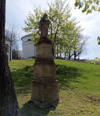 8 kwietnia 2024 , Kamienna figura św. Jana Nepomucena na dole wzgórza nieopodal świątyni Wniebowzięcia Najświętszej Marii Panny. Rzeźba posadowiona jest na trójczłonowym cokole gdzie pierwsze dwa człony cokołu posiadają prostokątne płyciny. Rzeźba przedstawia Jana Nepomucena w kontrapoście, ubranego w szaty kapłańskie. Święty adoruje krzyż trzymany przy piersi. Rzeźba pochodzi z 1889 roku.Skomentuj zdjęcie |