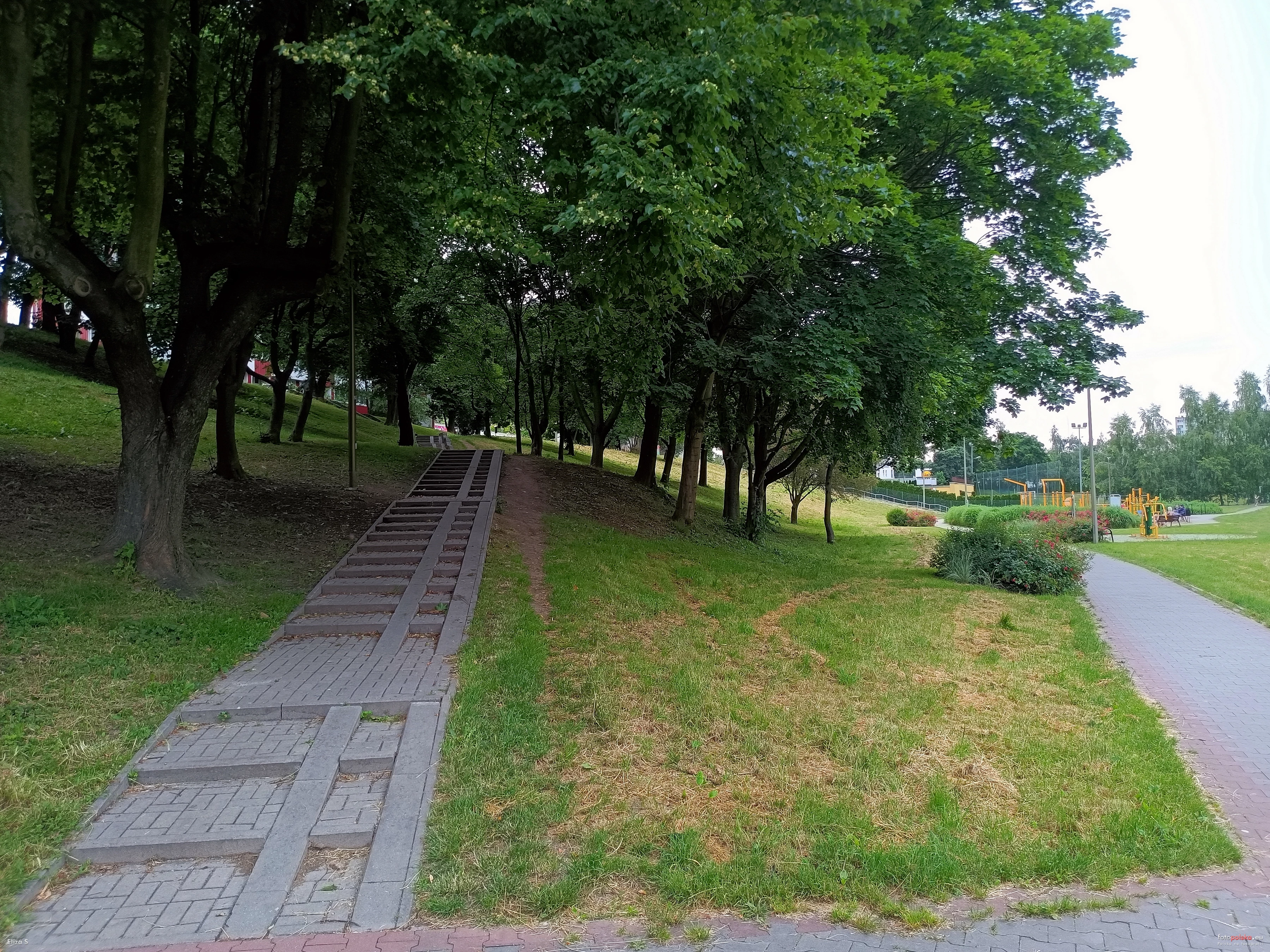 23 czerwca 2023 , Schody w wąwozie w kierunku wieżowców mieszkalnych przy ul. Okrzei. Z prawej w głębi urządzenia siłowni zewnętrznej i Street Workout.Skomentuj zdjęcie |