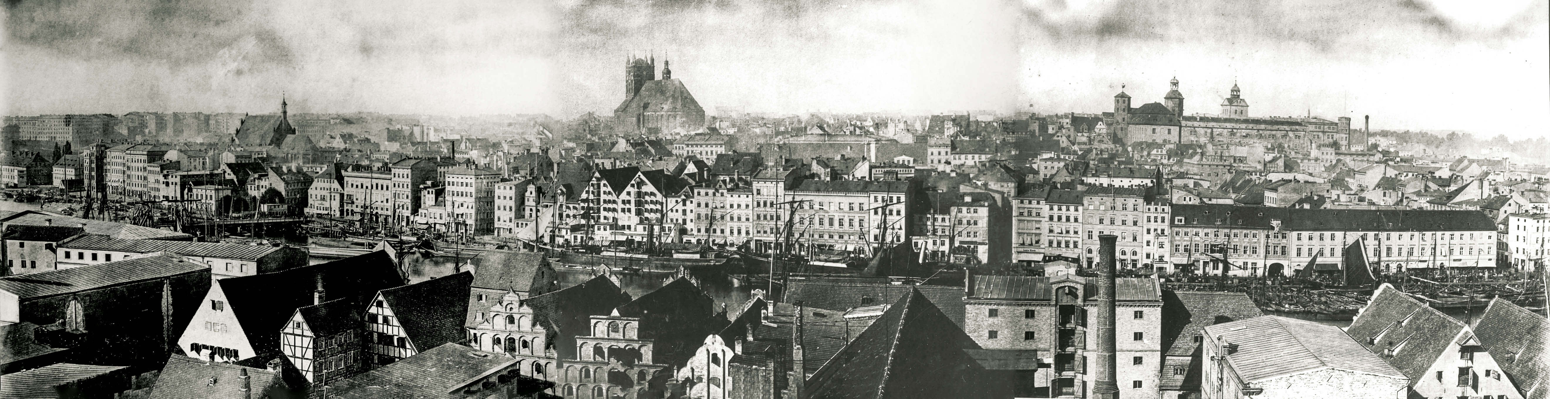 1863 , Przepiękna panorama z 1863 roku z dachami spichlerzy oraz zabudową Bollwerku na pierwszym planie. Oryginalnie są to 3 osobne zdjęcia, połączone przeze mnie w jedną panoramę.Skomentuj zdjęcie