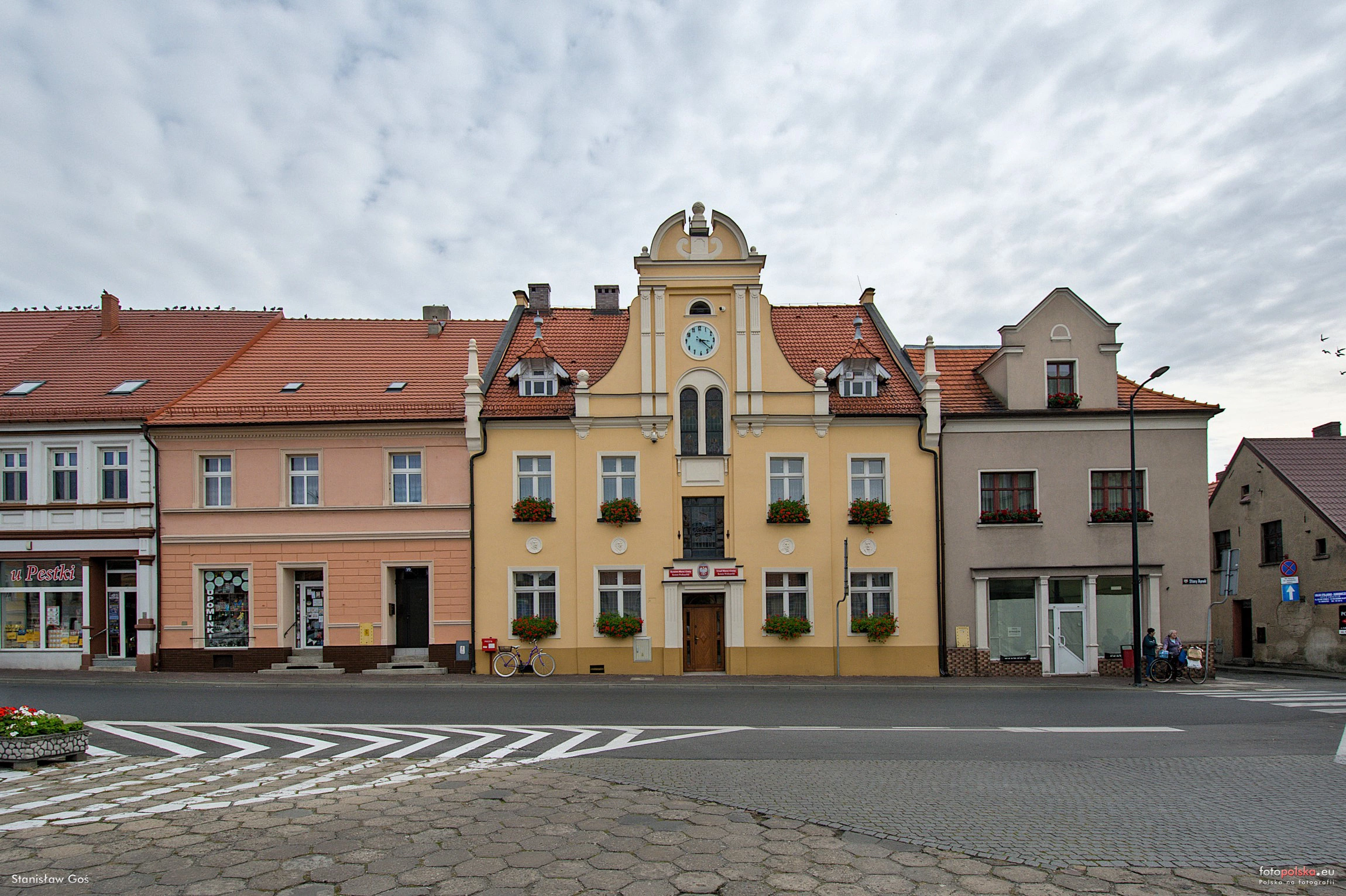 0 pobrań 482 odsłony 6 średnia ocen Poprzednie i następne zdjęcia Stanisław Goś Obiekty widoczne na zdjęciu Urząd Miasta i Gminy więcej zdjęć (6) Dawniej: Ratusz Ratusz stoi w zwartej zabudowie wschodniej pierzei Starego Rynku. Jest budynkiem piętrowym z użytkowym poddaszem, wzniesionym na planie kwadratu z przelotową sienią. Dwuspadowy dach kryty jest dachówkami. Elewację frontową zdobi płaski ryzalit zwieńczony szczytem ze spływami wolutowymi, zakończonym frontonem z kulą. Po bokach szczytu, w połaci dachu, znajdują się dwie drewniane facjatki. W podwójnym okienku nad wejściem znajdują się witraże z 1. ćwierci XX w.; wyżej – zegar z tego samego czasu. Na fasadzie, pomiędzy piętrami, umieszczono medaliony z głowami wybitnych obywateli miasta. Wewnątrz zachowały się oryginalne drewniane schody oraz boazerie w sieni i klatce schodowej. W budynku mieści się Urząd Miasta i Gminy. Źródło: Stary Rynek więcej zdjęć (109) |