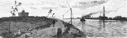1880 , Drzeworytnia Adolf Closs wg Gustav Schönleber. Widok na Świnę w kierunku północnym. Po lewej stronie Fort Anioła.Skomentuj zdjęcie |