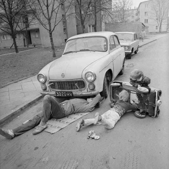 Lata 1970-1977 , Uliczny warsztat. Naprawa Syreny 104 i innego samochodu. |