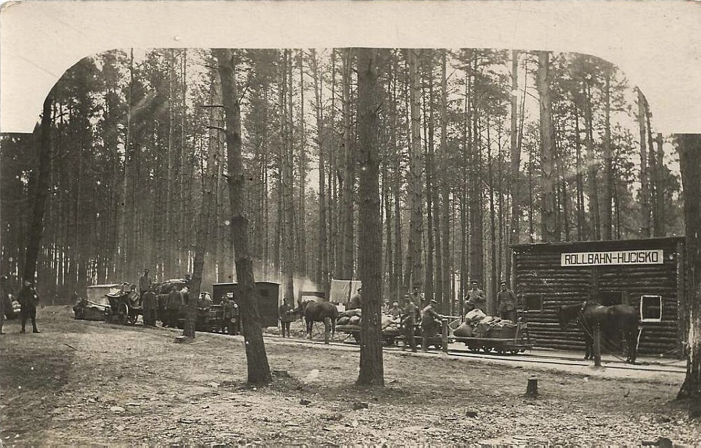 Lata 1914-1918 , Stacja Świętokrzyskiej Kolei Leśnej w Hucisku. Rollbahn oznacza linię frontową jakie C.K. armia budowała od końca 1914 roku - |