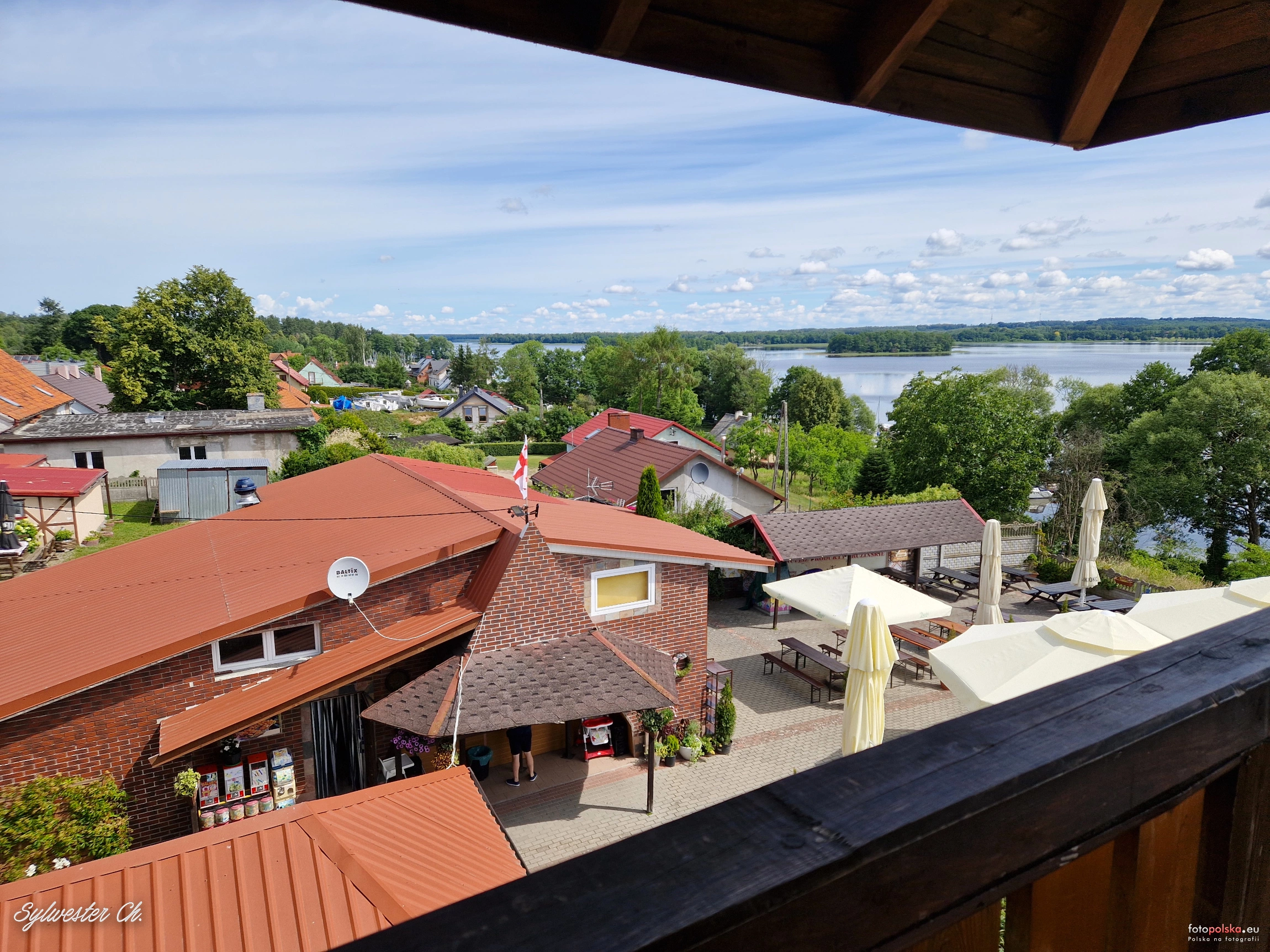 14 czerwca 2024 , Widok z wieży widokowej na zabudowania w Siemianach. W tle widać najdłuższe w Polsce jezioro (Jeziorak).Skomentuj zdjęcie