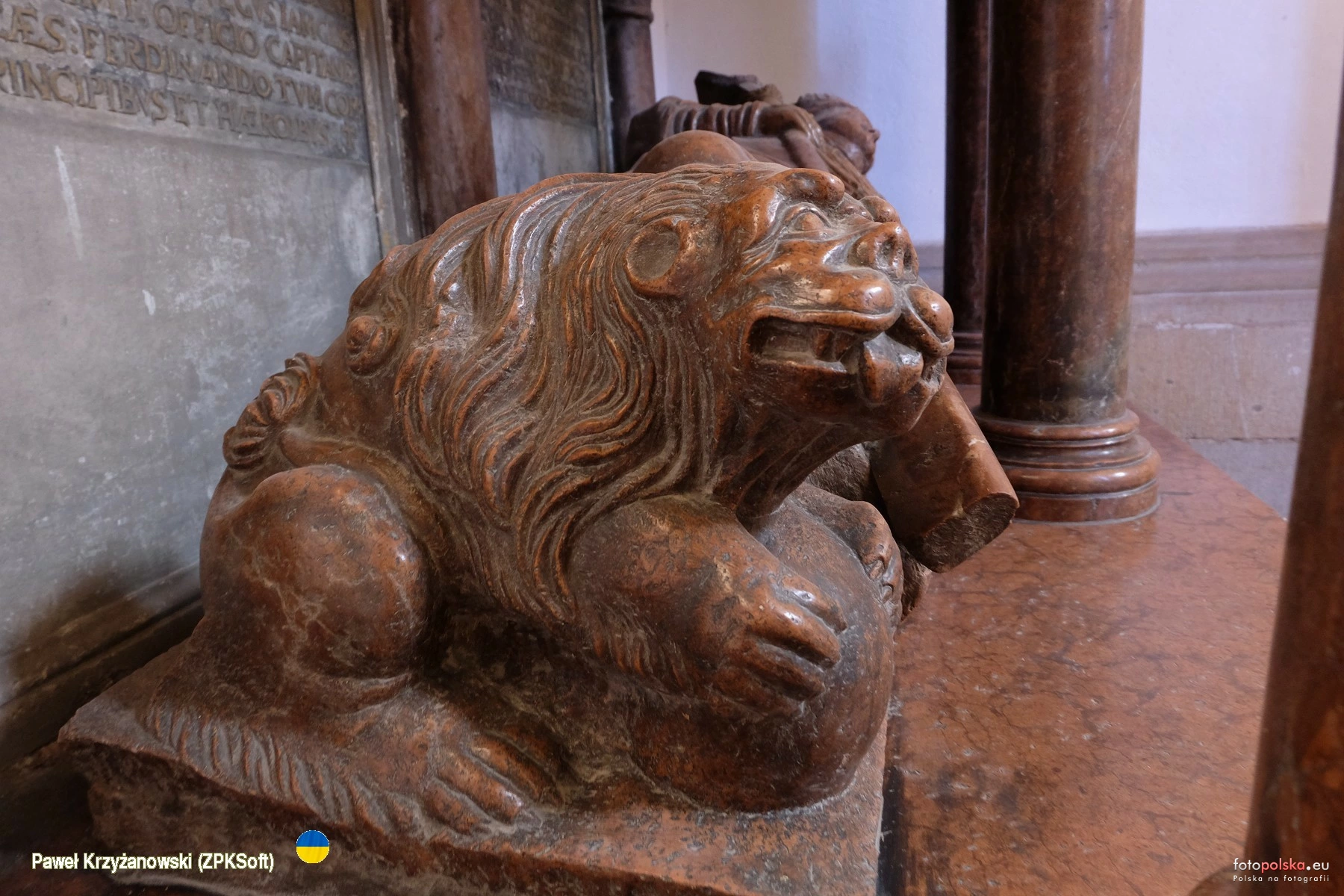 8 czerwca 2024 , Wykonana z czerwonego marmuru tumba Balthasara von Promnitza zmarłego w 1562, biskupa wrocławskiego (1539-1562) i starosty generalnego Śląska. Tumba stoi w kaplicy Matki Bożej Szkaplerznej. Na zdjęciu coś co miało wyglądać jak lew, umieszczone przy nogach zmarłego biskupa.Skomentuj zdjęcie |