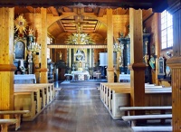 0 pobrań 212 odsłon 6 średnia ocen Poprzednie i następne zdjęcia Wiesław Smyk Obiekty widoczne na zdjęciu Wnętrza więcej zdjęć (4) Kościół św. Teodora więcej zdjęć (17) Zbudowano: 1725 Zabytek: A/124 z 21.08.1957 Zespół kościelny usytuowany jest w środku wsi, na niewielkim wyniesieniu. Kościół. Orientowany. Zaliczany do tzw. grupy „kraśnickiej” kościołów drewnianych, których główną cechą jest bezwieżowa fasada. Wzniesiony na planie składającym się z prostokątnej, szerokiej nawy, równego jej wysokością lecz nieco węższego, prostokątnego prezbiterium z zakrystią i sionką na przedłużeniu oraz niższej kruchty od zachodu. Zbudowany z drewna modrzewiowego, w konstrukcji wieńcowej wzmocnionej lisicami, obustronnie oszalowany, posadowiony na ceglanej (pierwotnie kamiennej) podmurówce. Wnętrze nakryte płaskimi stropami z zaokrągleniami w narożach. Strop nawy pokryty w części środkowej pseudokasetonami, wsparty dwiema parami czworobocznych słupów imitujących filary. Między nawą a prezbiterium prosta belka tęczowa oparta na przyściennych filarach. Chór muzyczny wsparty na belkach z zaciosami i dwu słupach. Korpus nawowy nakryty dachem dwuspadowy, nad prezbiterium nieco niższy dach trójpołaciowy. Na kalenicy nawy wieżyczka na sygnaturkę o barokowych formach, nakryta cebulastym hełmem. Więźba dachowa belkowo-kleszczowa. Elewacje szalowane pionowo deskami , podzielone lisicami i zwieńczone gzymsem podokapowym. W elewacji pn. wejście do zakrystii poprzedzone współczesnym gankiem na słupkach. Otwory okienne prostokątne, wielokwaterowe. Wyposażenie w większości z 1. ćw. XVIII w., regencyjne (ołtarze, ambona) W ołtarzu głównym i bocznym unikatowe antepedia z kurdybanu i obrazy, m.in. św. Teodora i św. Kajetana z poł. XVIII wieku. Dzwonnica. Wzniesiona na planie kwadratu, dwukondygnacjowa. Drewniana, konstrukcji słupowo-ramowej, oszalowana pionowo deskami łączonymi na wpust; nakryta dachem namiotowym pobitym gontem. W górnej kondygnacji szereg arkadowych otworów dzwonowych zasłoniętych wtórnie żaluzjami. Ogrodzenie o charakterze barokowym, z bramami (od pd. współczesna) i bramkami oraz kapliczkami w murze. W narożu ogrodzenia murowana ośmioboczna kostnica nakryta daszkiem namiotowym zakończonym pazdurem. W ogrodzeniu umieszczona płyta nagrobna S. Spinka, na cmentarzu przykościelnym nagrobek F. Grodzickiej z 1852 roku. Za /p> |