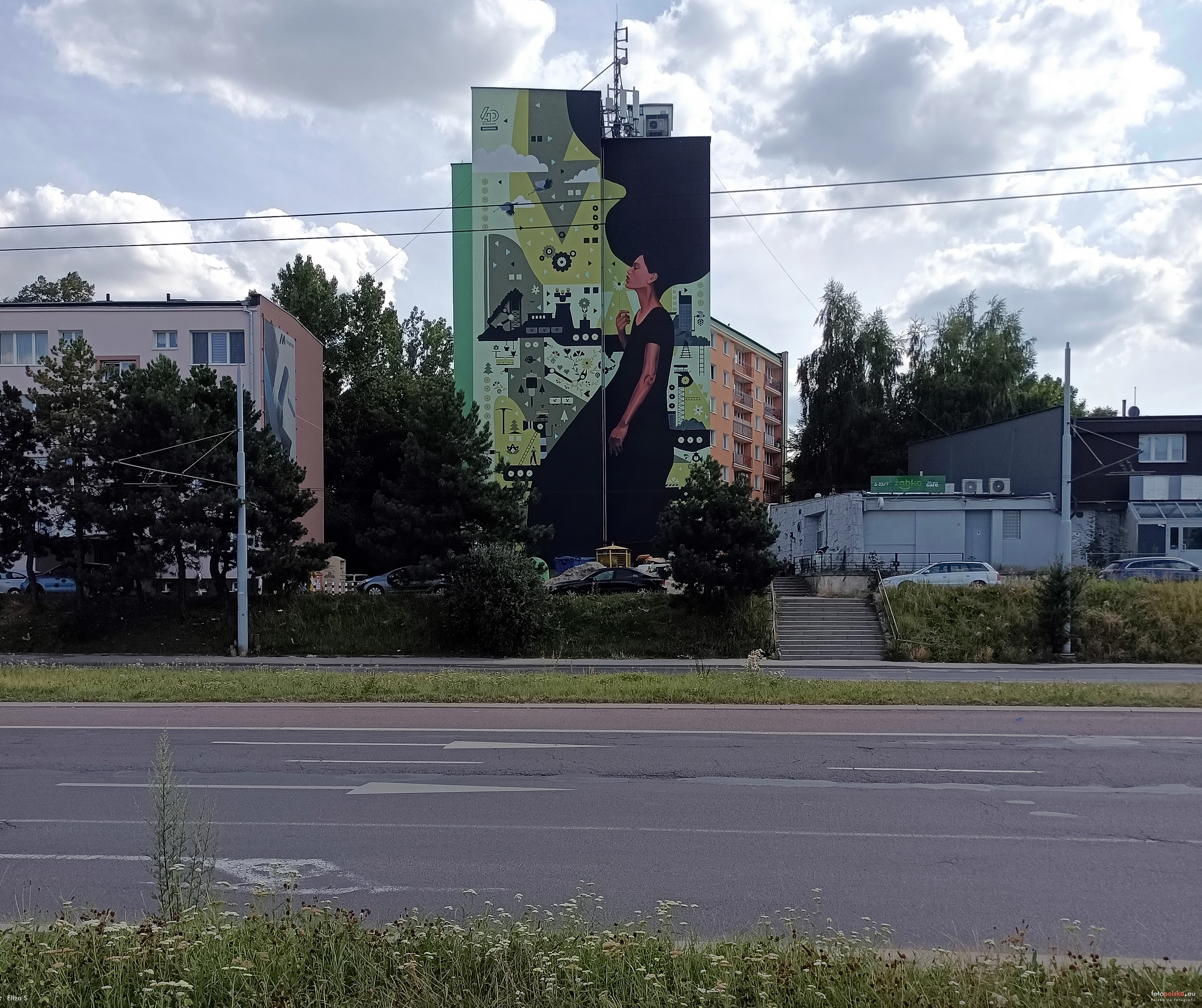 21 lipca 2024 , Fragment ulicy Mełgiewskiej, na wprost wieżowiec mieszkalny Montażowa 12 z muralem „Kopalnia blisko natury”. Z prawej budynek Montażowa 14.Skomentuj zdjęcie |