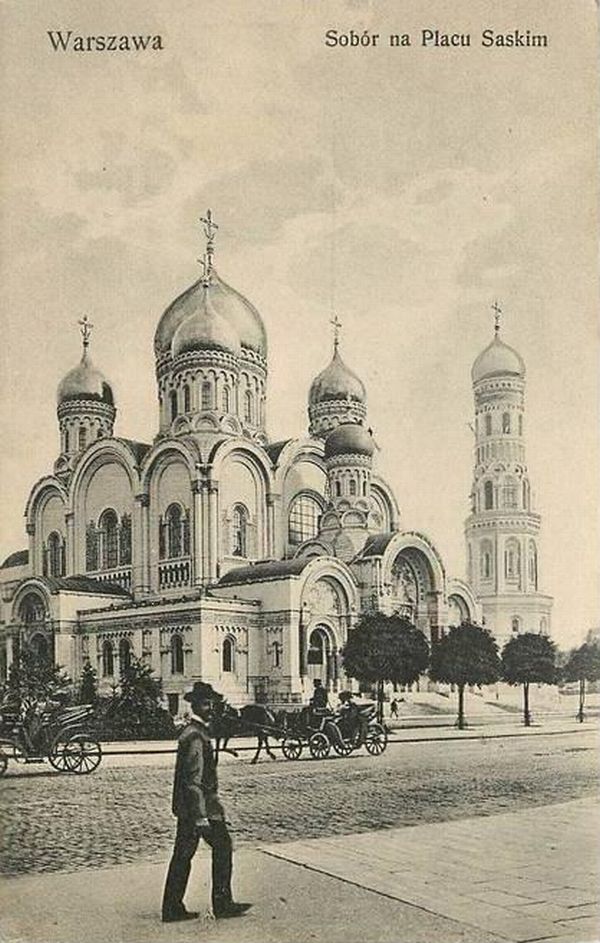 Sobór św. Aleksandra Newskiego więcej zdjęć (87) Architekt: Leontij Benois Zbudowano: 1894-1912 Zlikwidowano: 1924-1926 Dawniej: w l. 1916-1918 Kościół Garnizonowy (ewang.-kat.) pw. św. Henryka II, po 1918 r. Kościół Garniz. WP Sobór św. Aleksandra Newskiego – prawosławna katedra, która znajdowała się w Warszawie na placu Saskim (obecnie plac Piłsudskiego), wybudowana przez rosyjskie władze w okresie zaborów. Budynek soboru wraz z stojącą oddzielnie dzwonnicą został zaprojektowany przez rosyjskiego architekta Leontija Benoisa i wybudowany w okresie między 1894 a 1912 rokiem. Po ukończeniu, dzwonnica mierząca 70 m wysokości była najwyższą budowlą stolicy. Sobór został rozebrany w latach 20., mniej niż 15 lat po ukończeniu budowy. Źródło [ Wikipedia]. Autorzy: [ Wikipedyści]. Licencja [ CC-BY-SA-3.0]pl. Piłsudskiego Józefa, marsz. więcej zdjęć (3650) Dawniej: Plac Zwycięstwa, Adolf Hitler Platz, Plac Saski, Plac Soborowy |