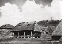 Lata 1980-1986 , Skansen budownictwa regionalnego u stóp zamku Lipowiec. Fotografia zamieszczona w albumie Jerzego Baranowskiego pt. "Wędrówki", Krajowa Agencja Wydawnicza, Kraków 1987, fot. 13. Na pierwszym planie w centrum fotografii widoczny jest spichlerz z Giebułtowa.Skomentuj zdjęcie |