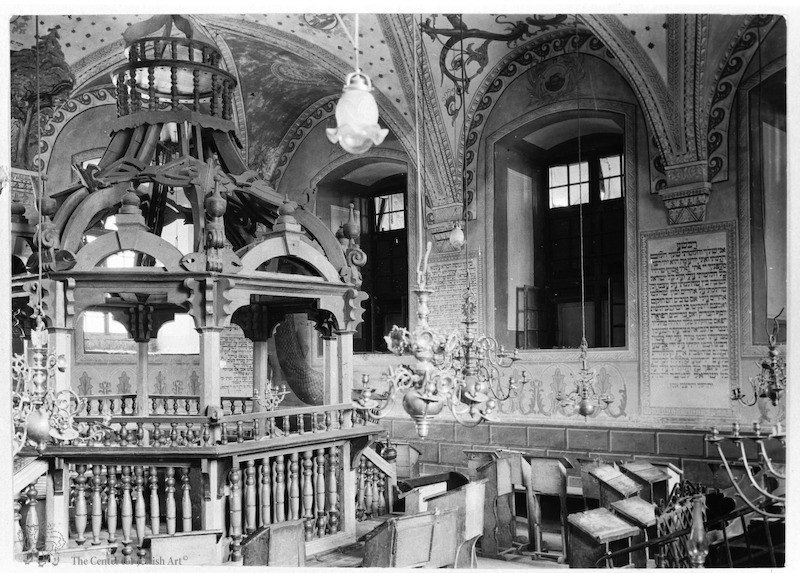 Lata 1920-1939 , Synagoga w Chęcinach, wnętrze, rzeźbiona bima i polichromie, fot.Szymon Zajczyk, przed 1939Skomentuj zdjęcie