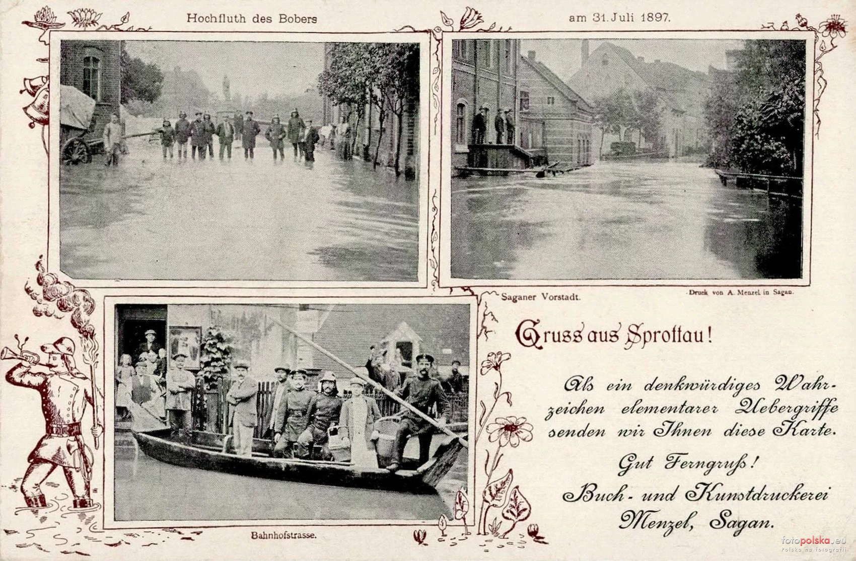 do ZPKSoft: Mogę się mylić, ale wydaje mi się, że jednak Żagań. Zdjęcie po prawej opisane jako przedmieścia Żagania, po lewej w tle być może widoczny pomnik Fryderyka III, na dole ulica Dworcowa, która przewija się na innych widokówkach z powodzi w Żaganiu oraz miejscowe wydawnictwo. Nie wiem skąd się wziął nadruk z pozdrowieniami ze Sprottau, ale być może to forma cegiełki przeznaczonej do sprzedaży właśnie w tym mieście. Nie mam pewności. 2024-09-09 15:42:36 (rok temu)