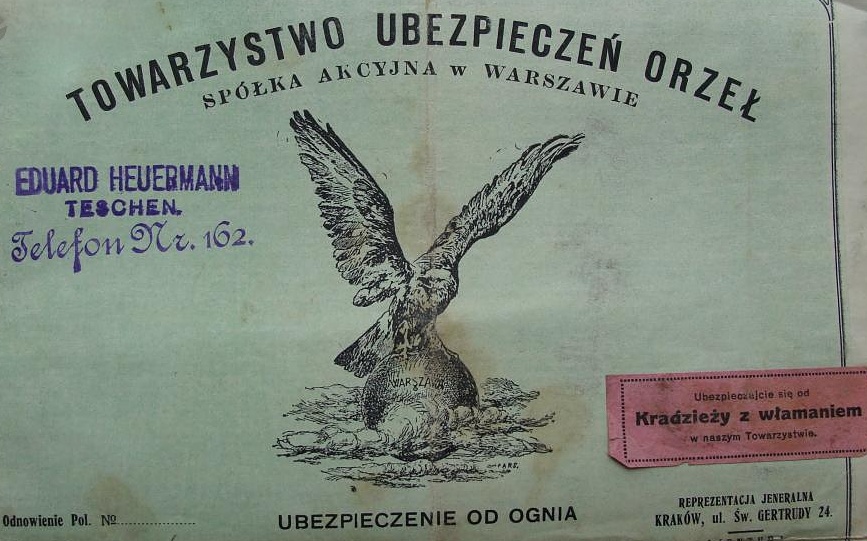 luty 1923 , Fragment polisy Towarzystwa Ubezpieczeń "ORZEŁ". Cieszyńską agencję prowadził Edward Heuermann. Jej siedziba mieściła się w kamienicy.Skomentuj zdjęcie |