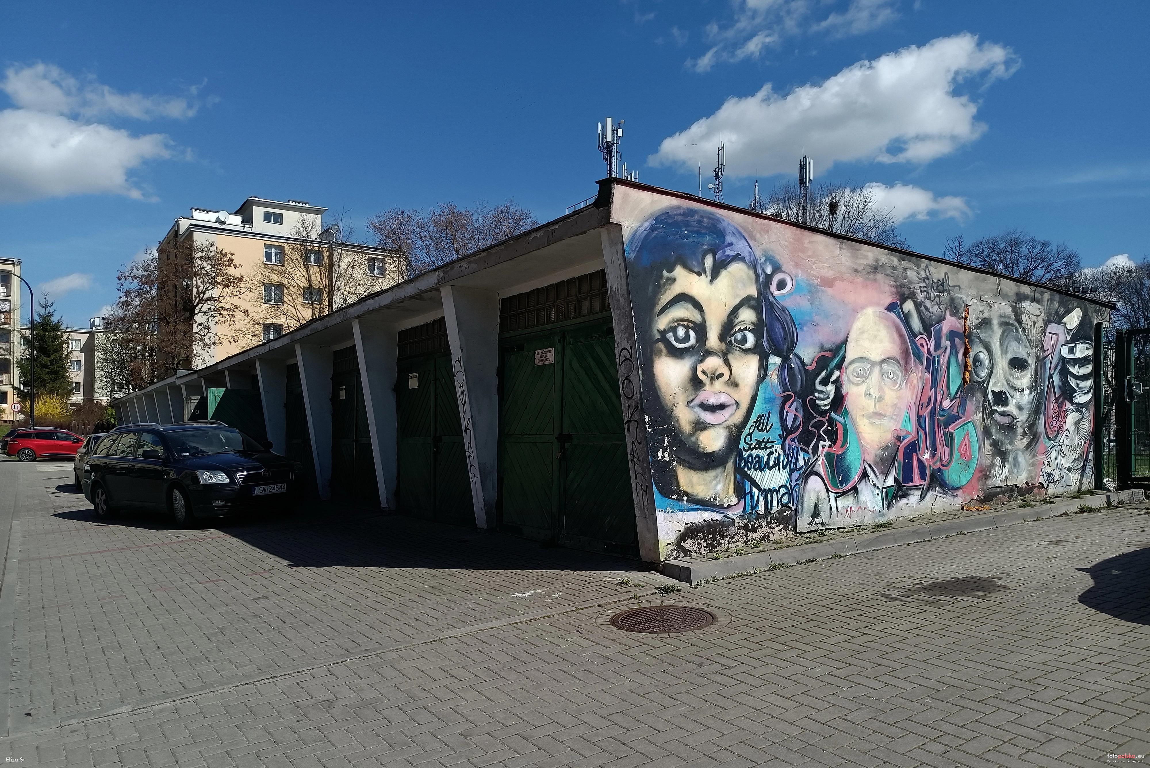 29 marca 2024 , Garaże przy ulicy Hotelowej 8, na bocznej ścianie widoczny mural.