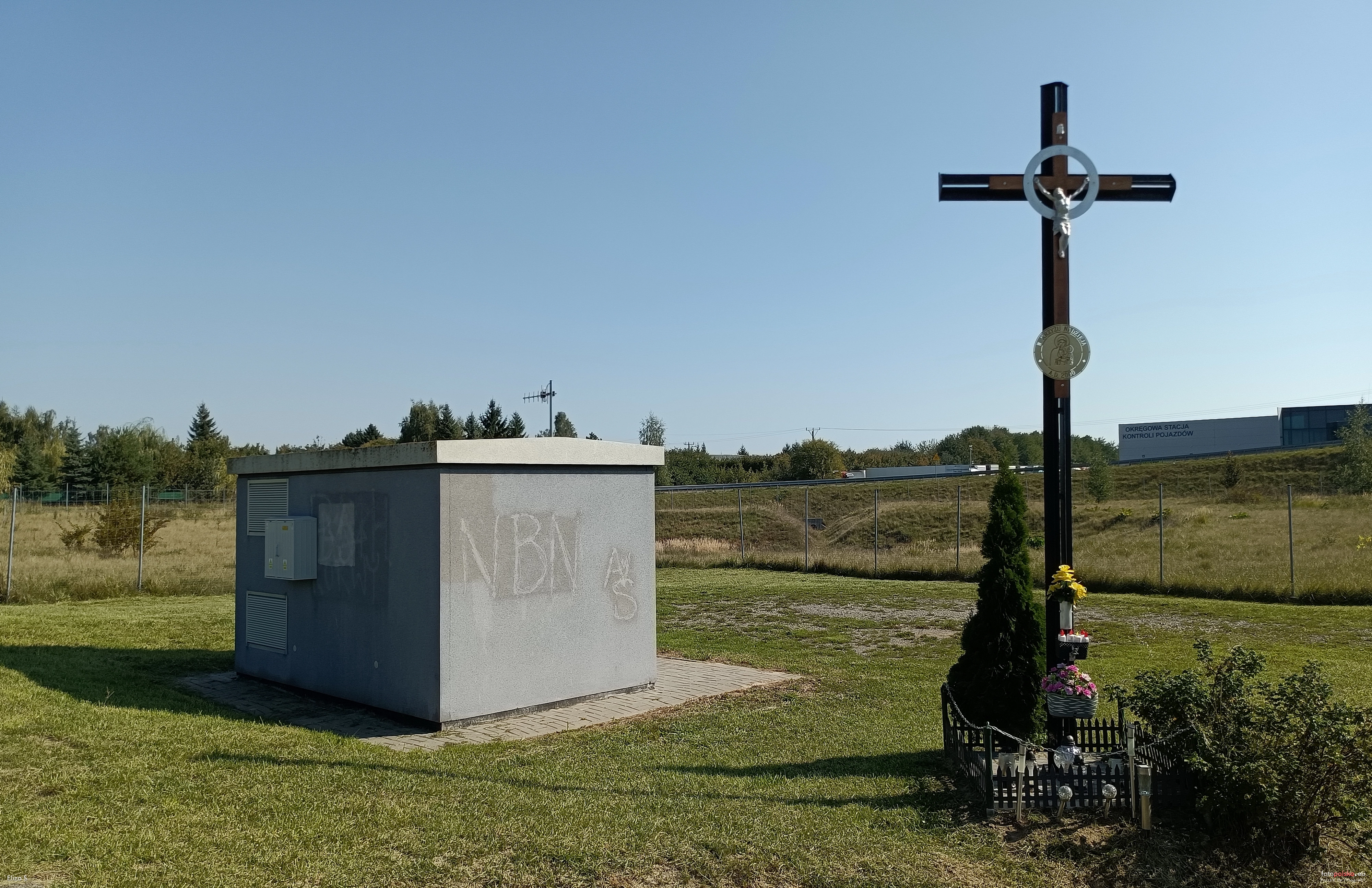 21 września 2024 , Krzyż przydrożny i trafostacja (z lewej) przy Alei Lotników Polskich. W głębi kadru za ogrodzeniem suchy zbiornik ppoż.Skomentuj zdjęcie |