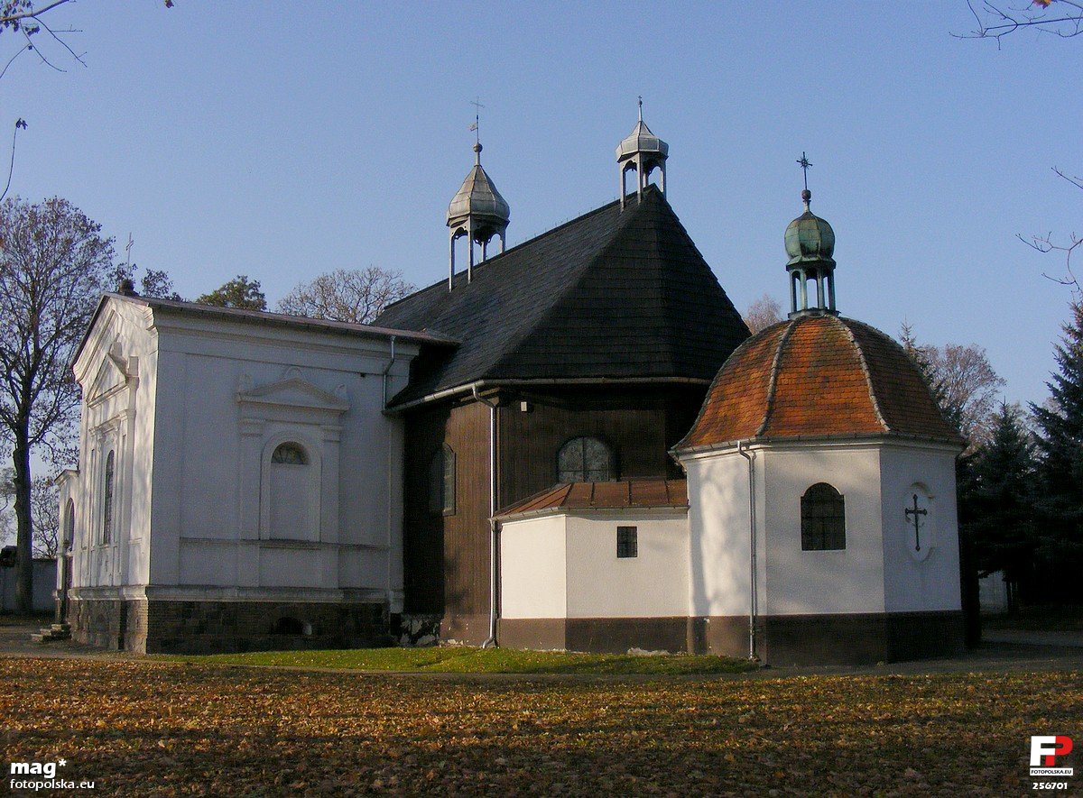 9 listopada 2011 , Drewniany kościół z 1610 r. Widoczne, murowane, kaplica grobowa Potockich i zakrystia zostały dobudowane później.Skomentuj zdjęcie