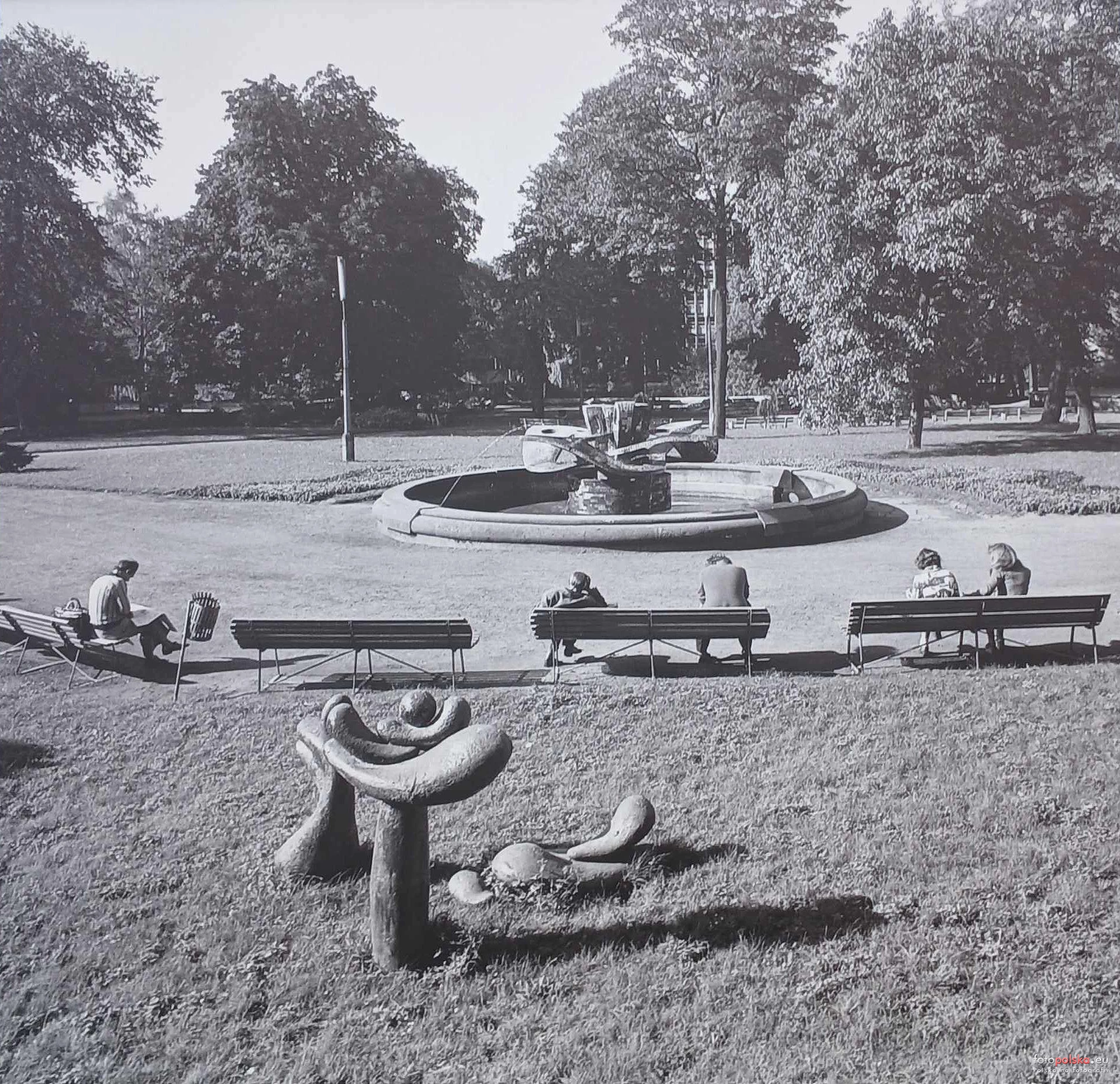 Lata 1974-1978 , Fontanna autorstwa Floriana Jesionowskiego w otoczeniu plenerowych rzeźb uczniów z liceum plastycznego w Opolu.Skomentuj zdjęcie