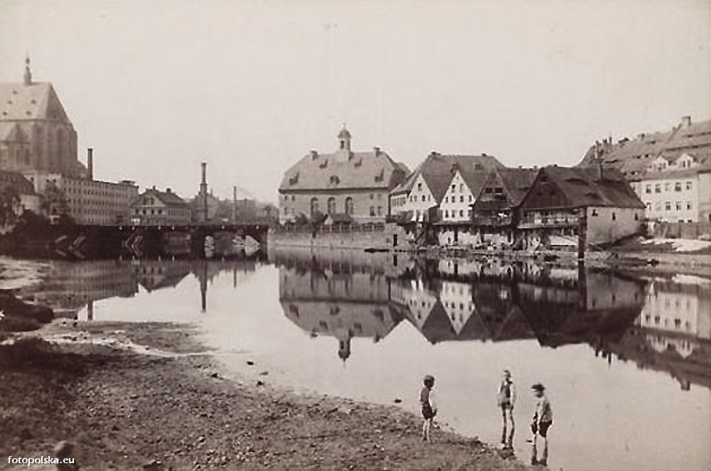 Lata 1895-1897 , Widoczny drewniany Most Staromiejski a na wschodnim brzegu Nysy stary kościół p.w. Św. Ducha (Alte Heilig-Geist-Kirche) .Skomentuj zdjęcie |