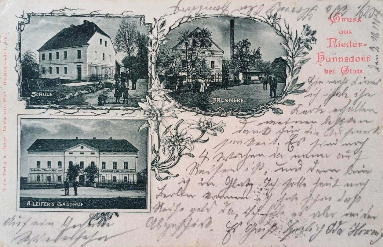 Lata 1899-1904 , Jaszkowa Dolna na karcie pocztowej z przełomu wieków XIX i XX; na zdjęciu po prawej komin gorzelni należącej do gospody A. LeiferaSkomentuj zdjęcie