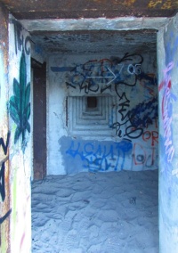11 października 2024 , Ciężki schron bojowy "Sęp" - wejście do obiektu, w głębi widoczna wewnętrzna strzelnica obrony wejścia.Skomentuj zdjęcie |