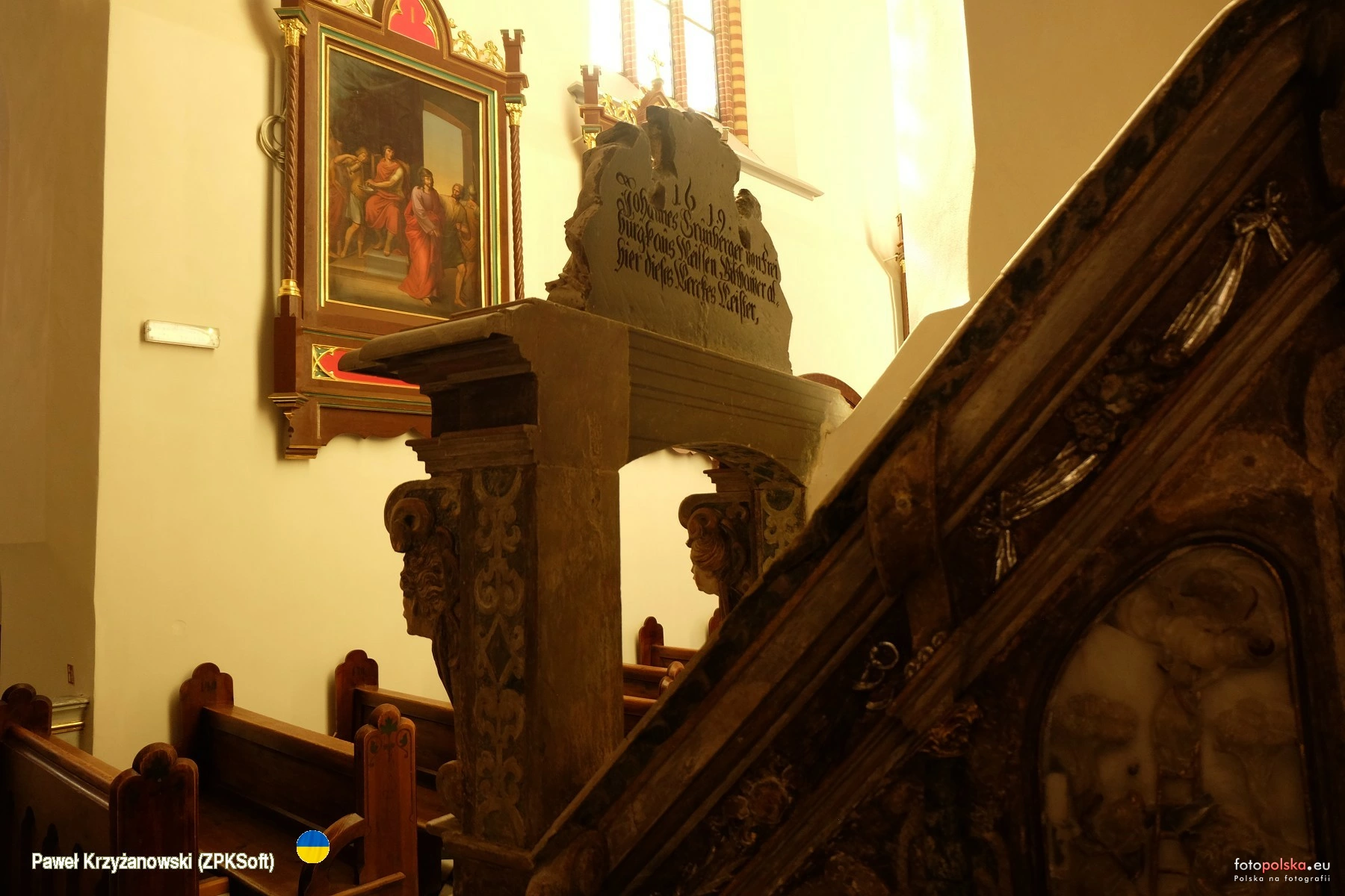 22 września 2024 , Wnętrze kościoła św. Anny, który jest największą świątynią Ząbkowic. Jego początki sięgają XIII w. ale w obecny gotycki kształt nadano mu z pocz. XV w., później przez wieki ulegał przebudowom. Świątynia jest trójnawowym, ośmioprzęsłowym kościołem halowym. Wyposażenie pochodzi z różnych epok od gotyku po wiek XIX w. Na zdjęciu ambona pochodząca z 1619 r. czyli w okresie gdy świątynia należała do protestantów. Wejście na ambonę oraz kosz ambony od wewnątrz są pokryte inskrypcjami.Skomentuj zdjęcie |