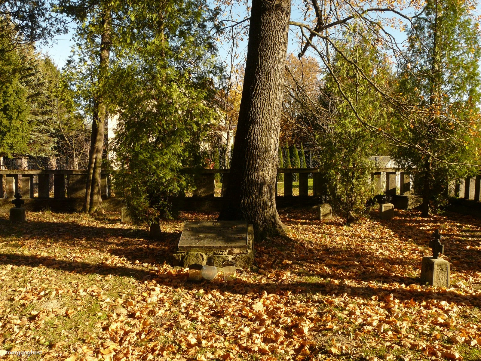 Cmentarz wojenny nr 98 więcej zdjęć (13) Architekt: Hans Mayr Atrakcja turystyczna Zbudowano: 1916-1918 Zabytek: A-637 z 30.10.1991r. Cmentarz wojenny nr 98 Gorlice - Glinik Mariampolski. Zaprojektowany przez Hansa Mayra. Zbudowany na planie prostokąta, otoczony sztachetowym betonowym murem. Wejście stanowi betonowa łukowata przesklepiona brama zwieńczona krzyżem typu rosyjskiego, wewnątrz dwuskrzydłowa metalowa furtka. Pierwotnym centralnym elementem był tu wysoki drewniany krzyż, nie postawiony na nowo przy okazji remontu. Zamiast niego "Komitet Upamiętnienia Bitwy Gorlickiej" postawił żeliwną tablicę informacyjną z herbem Rosji. Pochowano tutaj 254 żołnierzy rosyjskich w 33 grobach zbiorowych i 6 pojedynczych. Polegli w maju 1915 w bitwie pod Gorlicami. |