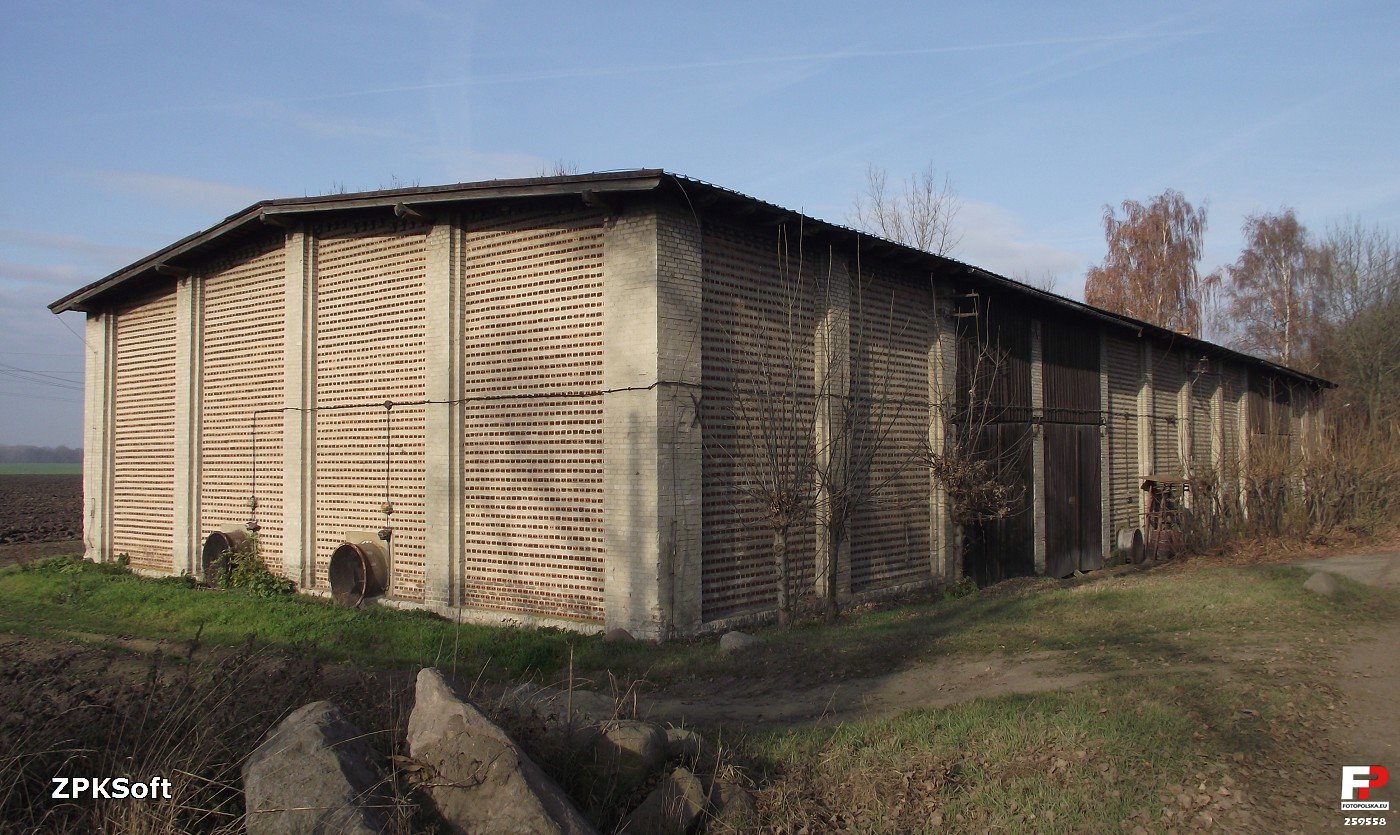 19 listopada 2011 , Współcześnie postawiona stodoła z cegły dziurawki stoi przy jednej z dróg w Warkoczu. Wentylatory rozmieszczone wokół budynku wyglądają na użytkowane.
