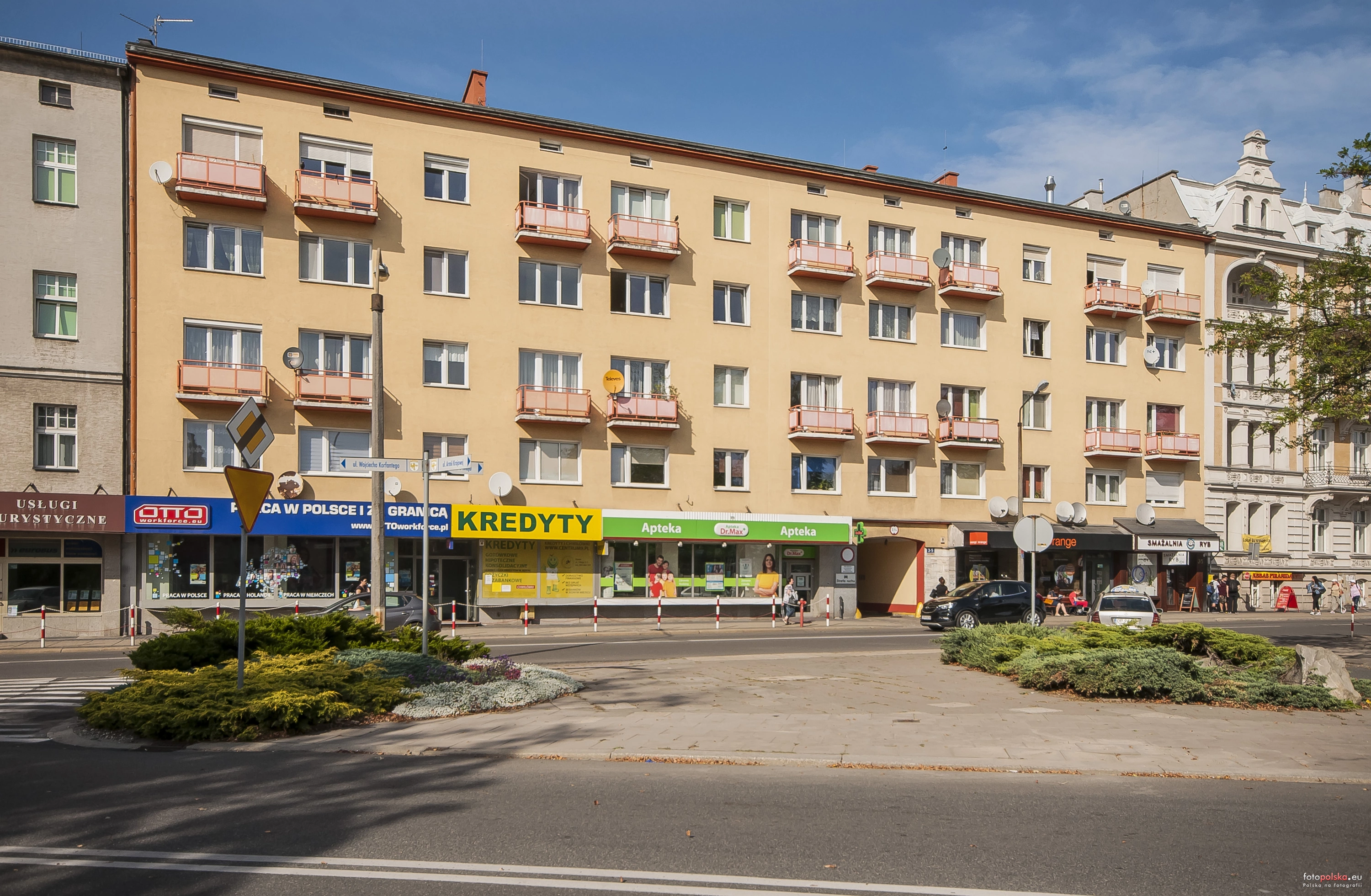 W miejscu dzisiejszego domu przy ul. 1 Maja 3-5 stał przed wojną wzniesiony jeszcze przed końcem XIX wieku hotel Central. Od tego domu hotelowego rozpoczęła się na przełomie wieku zabudowa nowej, dopiero co powstałej ulicy 1 Maja, wówczas Zimmerstrasse. Hotel wraz z kamienicą sąsiednią zostały zrujnowane w czasie wojny. Na ich miejscu stanął w 1958 roku wybudowany przez Społem dom mieszkalny z usługowym parterem.