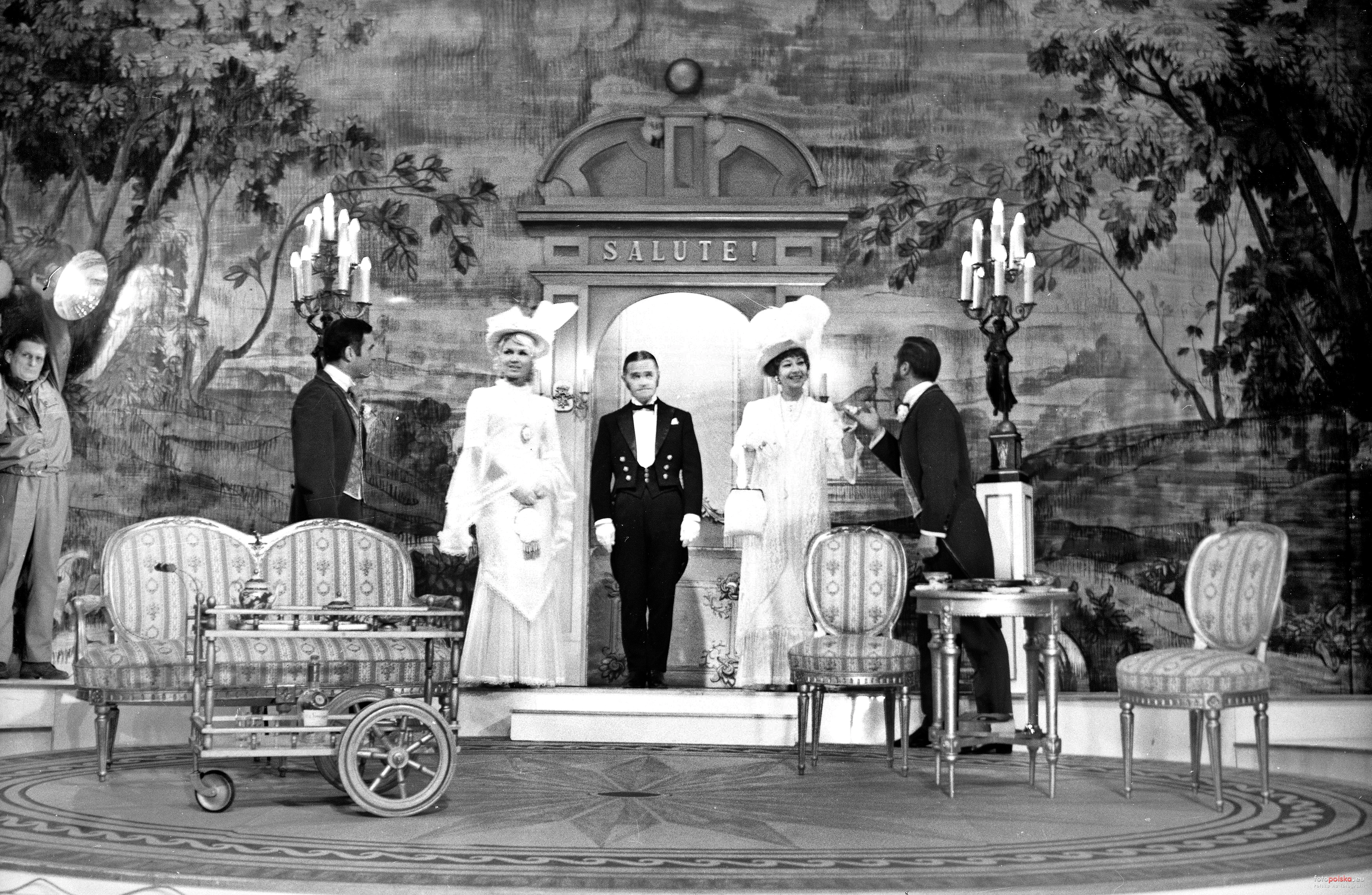 1969 , Scena Teatru Syrena - sztuka "Lord z walizki". Od lewej: Bolesław Woźniak (Jack Worthing), Ludmiła Terlecka (Dolly Fairfax), Adolf Dymsza (Lane), Irena Kwiatkowska (Lady Bracknell) i Ryszard Pikulski (Algernon Moncrieff).Skomentuj zdjęcie |