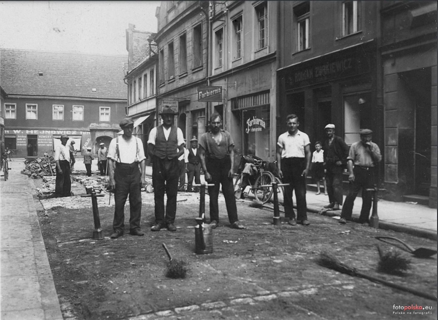 Lata 1930-1939 , Układanie bruku na ulicy Wolności w Lesznie.Skomentuj zdjęcie |