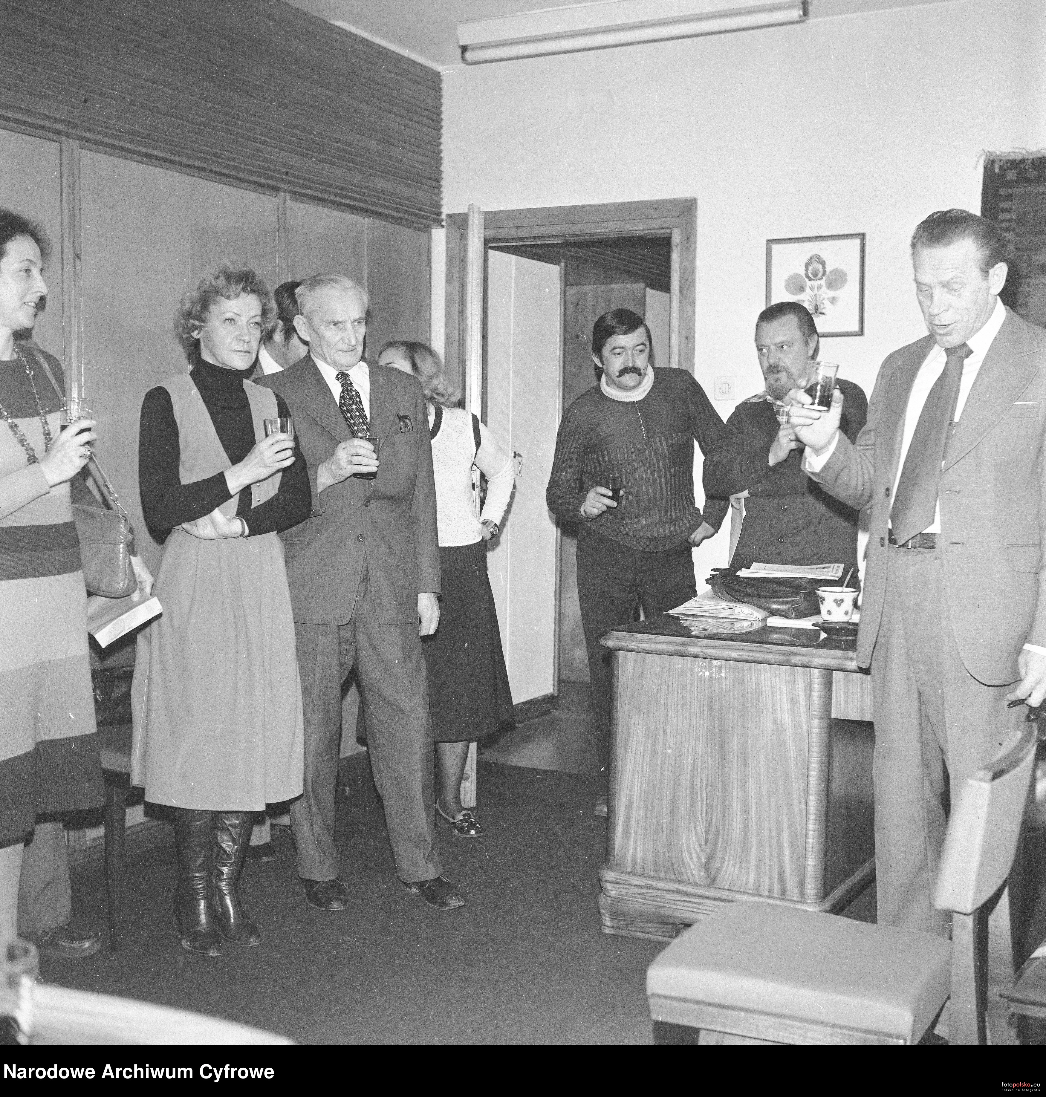31 grudnia 1977 , Spotkanie sylwestrowe w redakcji "Dziennika Ludowego". Członkowie redakcji wznoszą toast - 1. z prawej redaktor naczelny Piotr Ziarnik, 2. z prawej Mieczysław Owczarczyk, 3. z prawej Stefan Robotowski, 1. z lewej Wanda Dudzik, 2. z lewej Irena Radlińska.Skomentuj zdjęcie |