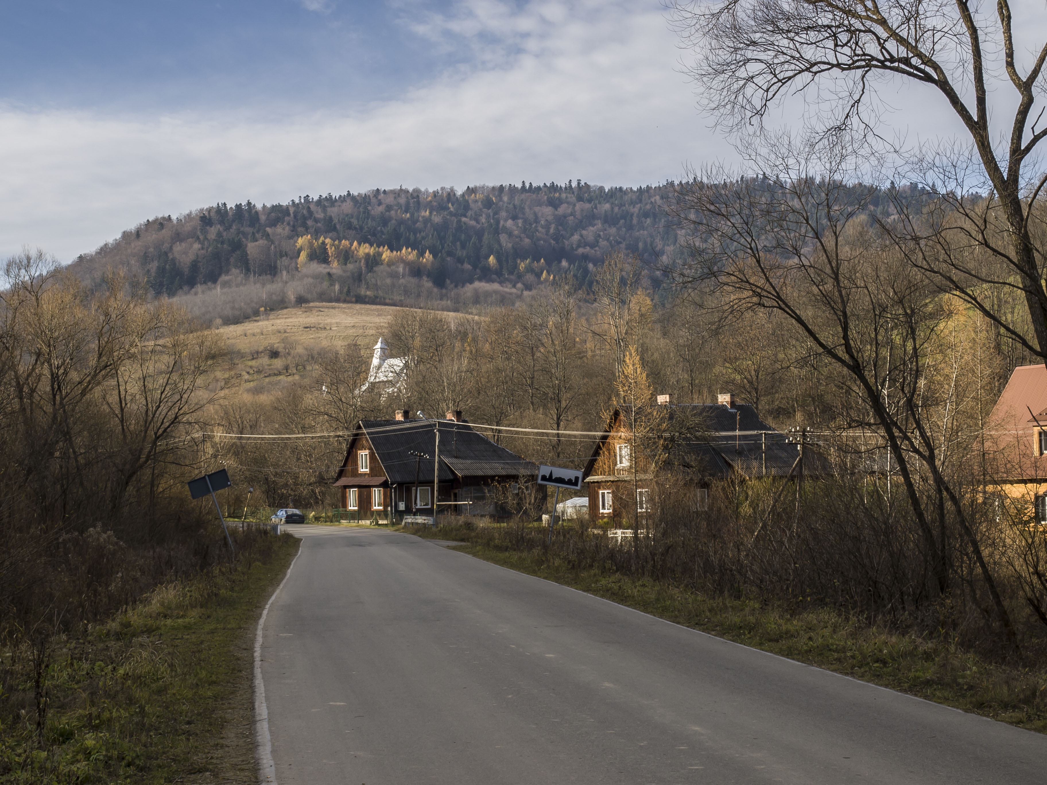 1 listopada 2010 , Zatwarnica. Wjazd do wsi od północy. Na zdjęciu widoczne domy o nr. 1 (fragment na prawej ramce), 2 i 3. Nad domem nr 3 na wzgórzu – kościół pw. Dobrego Pasterza.
