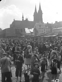 1936 , Targowisko przy ulicy Łagiewnickiej, a w tle kościół Wniebowzięcia Najświętszej Marii Panny.Skomentuj zdjęcie