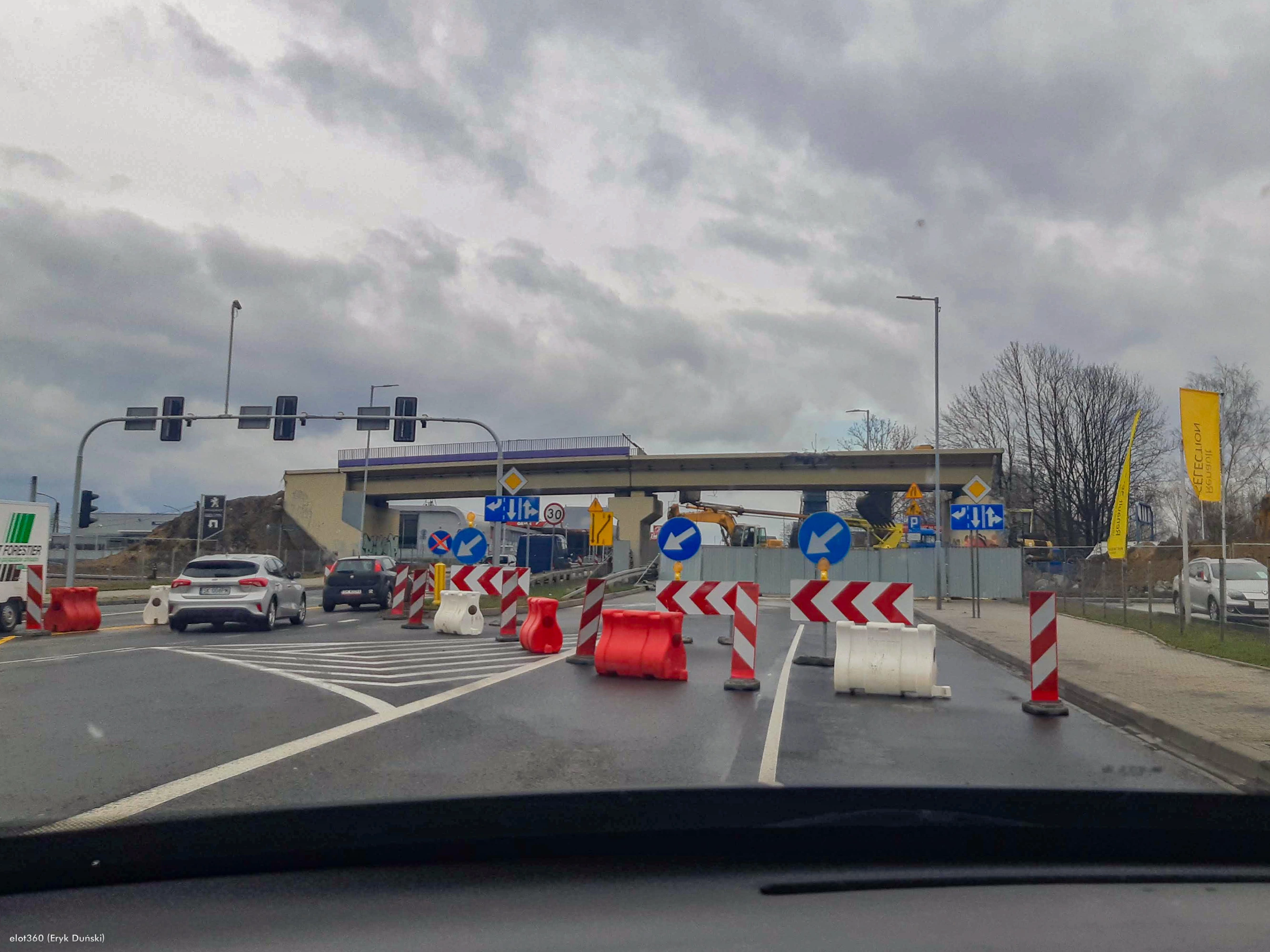 21 marca 2020 , Wiadukt i organizacja ruchu na ulicy Bocheńskiego w trakcie rozbiórki. Widok od strony południowej, zamknięta jezdnia w kierunku ChorzowskiejSkomentuj zdjęcie |