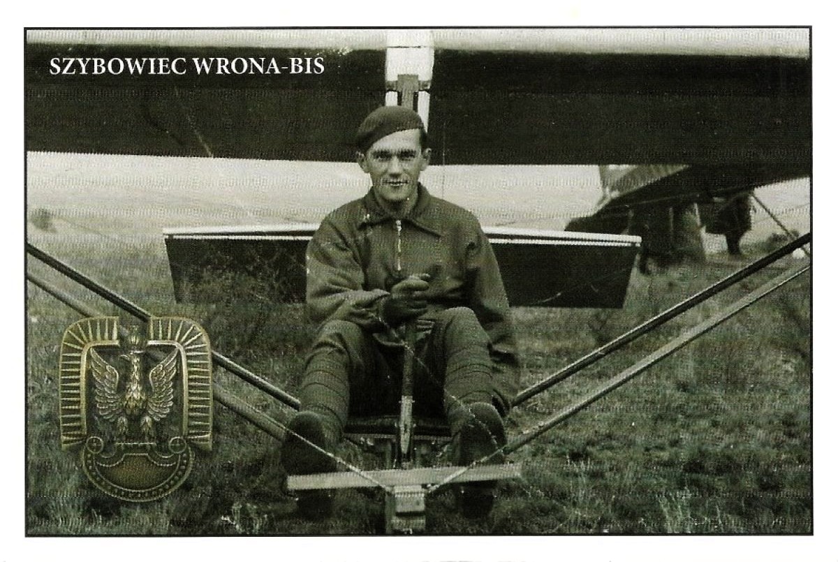 Szybowiec szklony Wrona-Bis, zaprojektowany przez inż. Antoniego Kocjana w 1934 r. Produkowany m.in. przez Wojskowe Warsztaty Szybowcowe w Krakowie dla Wojskowego Obozu Szybowcowego w Ustjanowej. Za sterami nieznany z nazwiska pilot. Fotografia ze zbiorów Sylwestra Pilicha (Fundatora pocztówki). Orzeł lotniczy wz. 26 z kolekcji Tomasza Zawistowskiego.