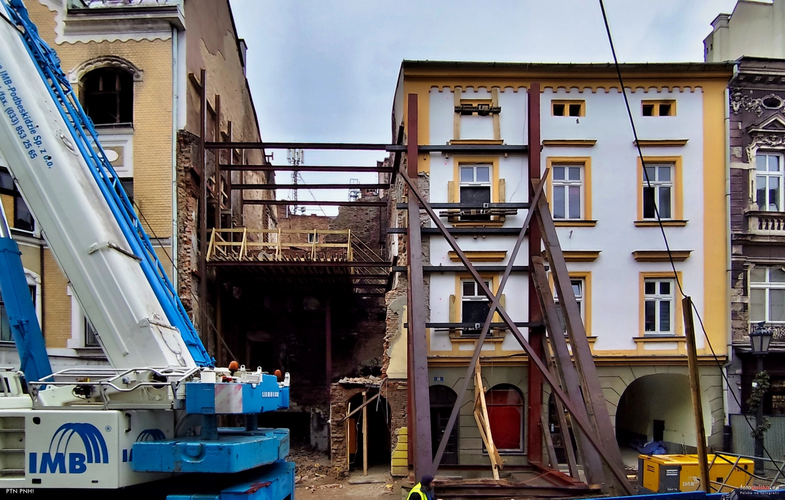 31 stycznia 2025 , Głęboka 30, zabezpieczono ściany zewnętrzne budynku, poprzez wykonanie dwóch stalowych ram od strony ul. Głębokiej oraz stalowych ściągów usytuowanych na I i II piętrze oraz na poddaszu budynku w oparciu o wcześniejsze ekspertyzy. Widoczna teź stalową konstrukcję rozporową pomiędzy budynkami Głęboka 30 i 34 wraz z podestem technologicznym.Skomentuj zdjęcie