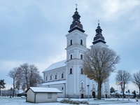 Trójosiową zachodnią fasadę ujmują dominujące dwie wieże z nieco cofniętą częścią środkową. Fasada jest rozczłonkowana pilastrami toskańskimi o wydatnie profilowanych gzymsach. Szczyt jest zwieńczony półkolistym naczółkiem i żelaznym krzyżem. Portal główny, zamknięty i obramiony półkolistym gzymsem, posiada drzwi zabezpieczone od wewnątrz kutą kratą żelazną, powstałą w 1846 r. Portale boczne, w częściach wieżowych, są prostokątne, obramione i w zwieńczeniu posiadają część półokrągłego gzymsu.