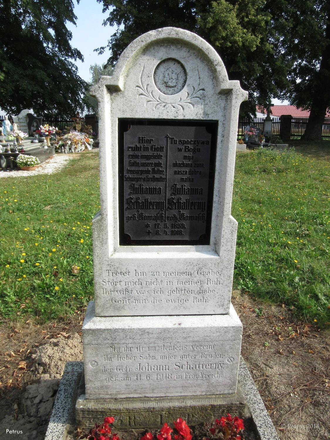 lipiec 2018 , Rzadko spotykany sposób dwujęzycznego zapisu informacji o osobie zmarłej. Na spodzie nagrobka wspomnienie syna poległego we Francji na I WŚSkomentuj zdjęcie |