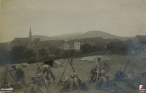 1915 , Biwak "turystów" z wrocławskich koszar - 1915 r., okolice ulic: Ogrodowej i Parkowej, widoczne kamienice przy Strehlener Strasse - Mickiewicza.Skomentuj zdjęcie
