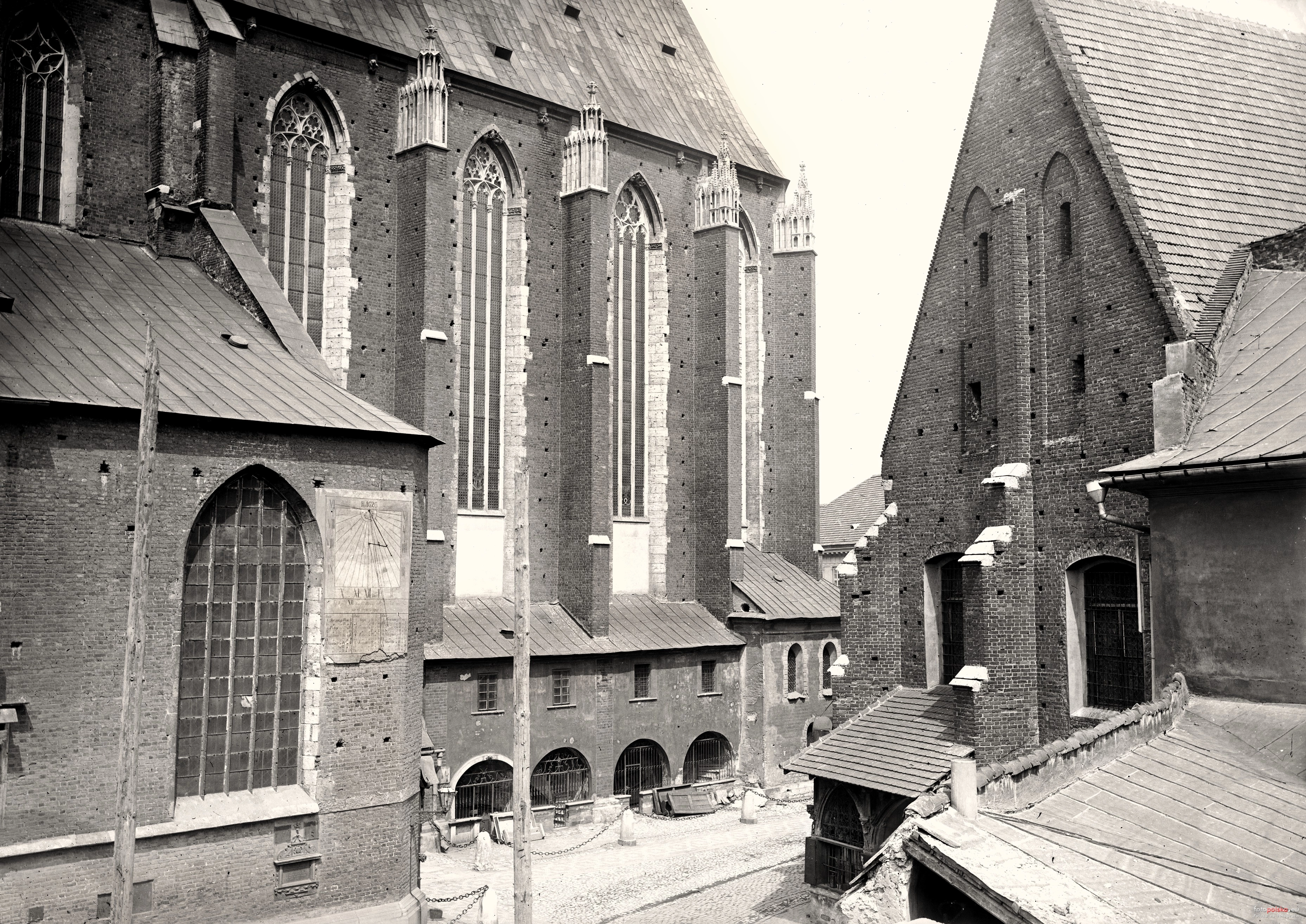1895 , Fragment pl. Mariackiego. Na elewacji Kościoła Mariackiego widoczny zegar słoneczny.Skomentuj zdjęcie
