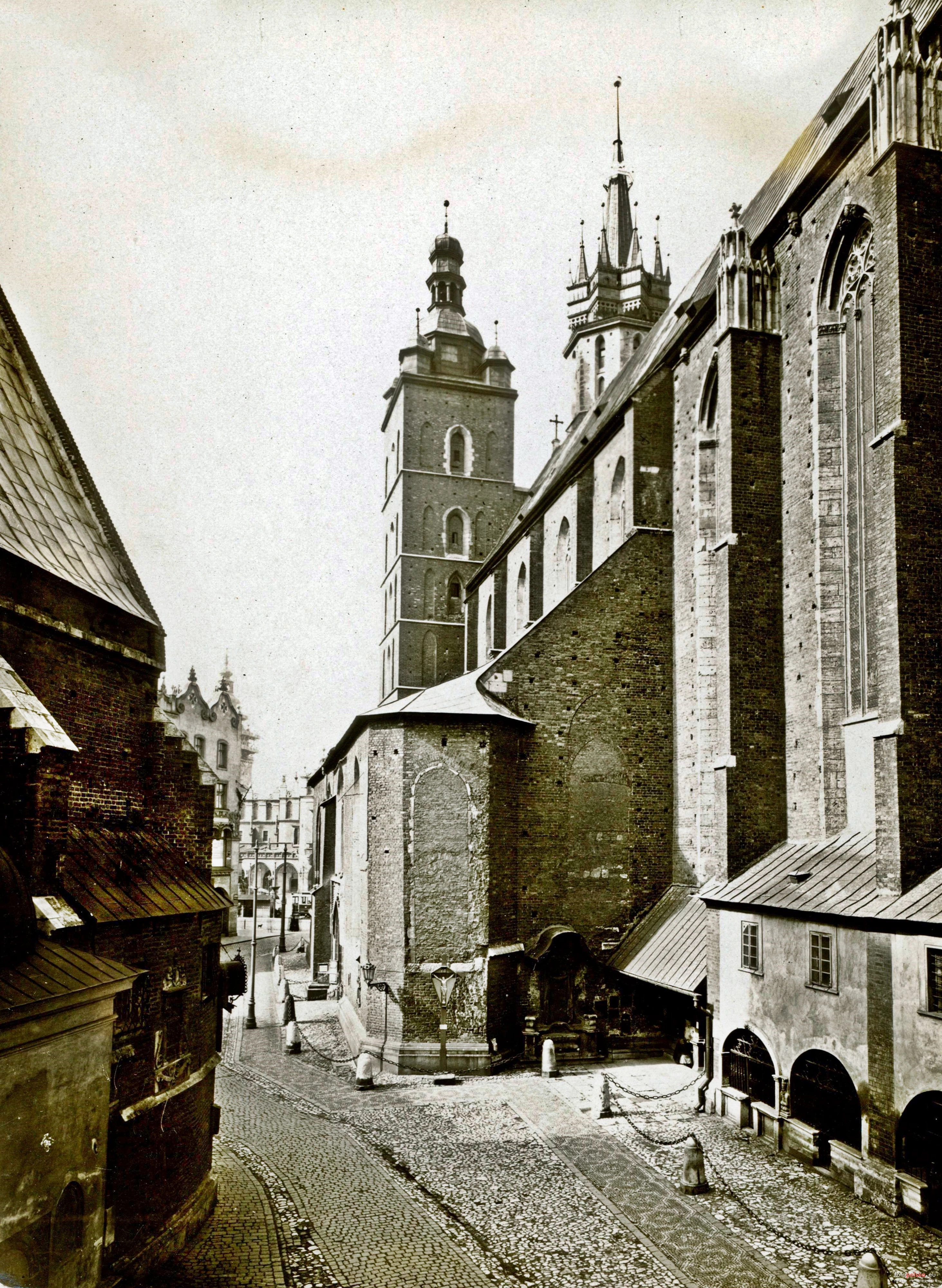 Lata 1908-1910 , Fragment zabudowy pl. Mariackiego, widoczne częściowo oba kościoły.Skomentuj zdjęcie |
