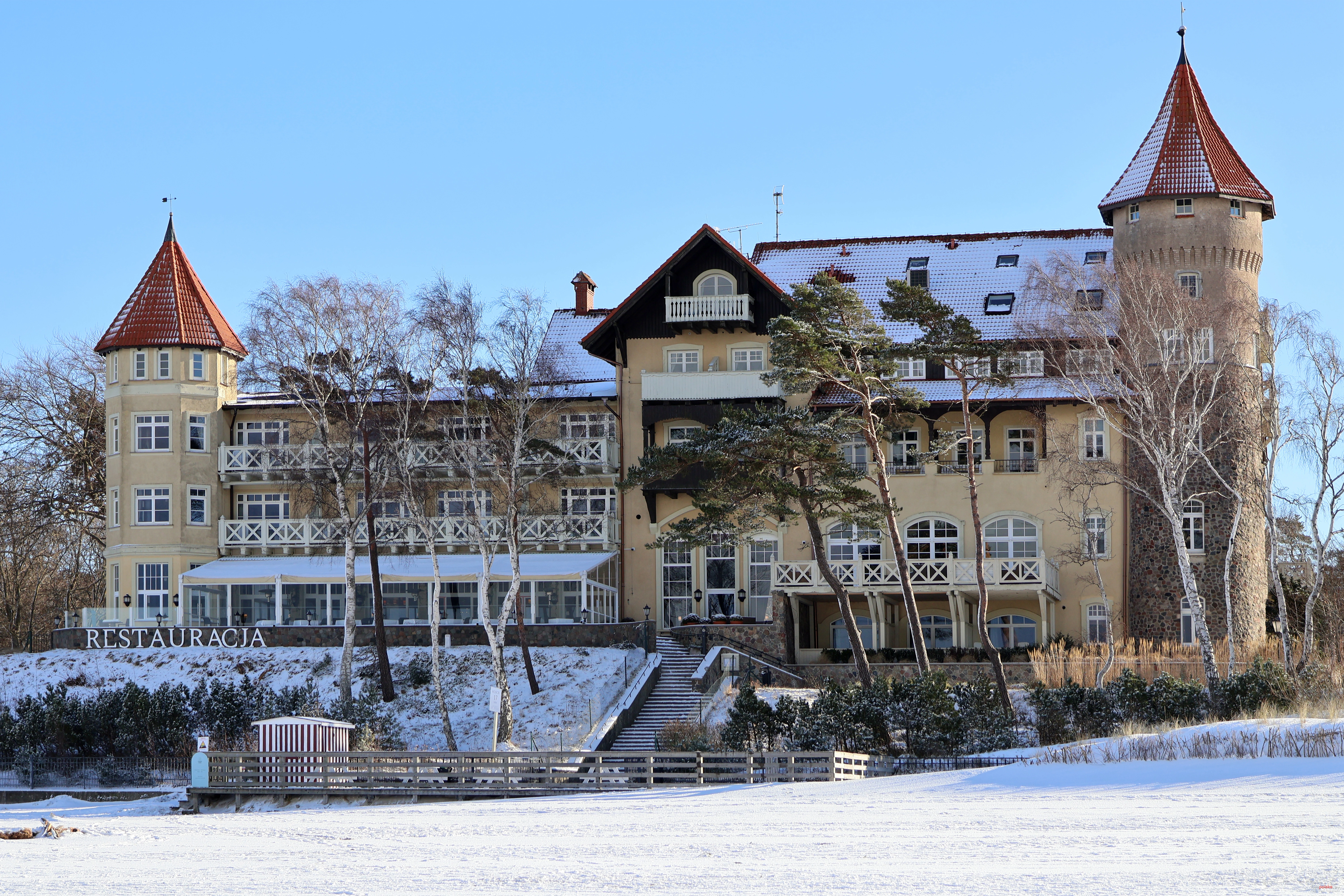 Dotychczasowy właściciel nie miał koncepcji uratowania obiektu, więc chciał się go pozbyć, tracąc przy tym niestety grubo ponad sto pięćdziesiąt tysięcy ówczesnych marek. W podjęciu decyzji pomógł mu sztorm, szalejący w lutym 1913 roku. 27 lutego tegoż roku właściciel hotelu w centrum miasta (obecnie Kościuszki 66), Max Nitschke, nabył zagrożoną nieruchomość za symboliczne pieniądze. Zapłacił tylko za teren i bardzo niewielką kwotę za budynek (po cenie materiału rozbiórkowego) oraz sprzęty i meble. Po zapisach notarialnych przystąpił niezwłocznie do prac zabezpieczających, aby nie dać się ubiec kolejnej nawałnicy).