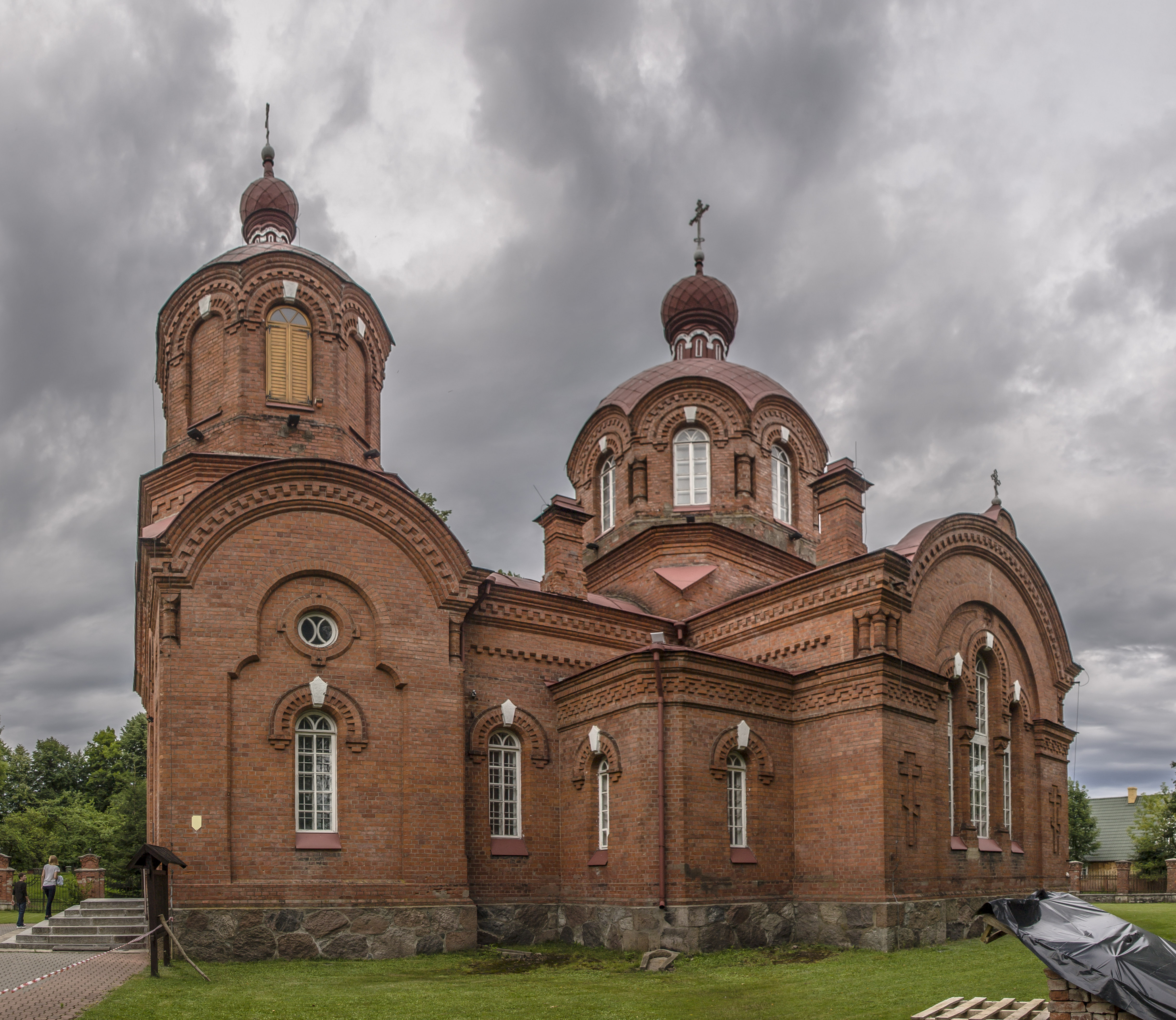 Budowla została wzniesiona z czerwonej cegły, którą na miejscu wyrabiał Niemiec sprowadzony z Górnego Śląska - Juliusz Karol Miller. Do postawienia fundamentów użyto ciosanych kamieni z Puszczy Białowieskiej. Bryłę świątyni zwieńczyły dwie kopuły. Jedna z nich była przeznaczona na dzwonnicę. Dzwon, o wadze 125 kg, był tak donośny, że w sprzyjających warunkach atmosferycznych jego głos niósł się aż na obrzeża Puszczy Białowieskiej. Z Petersburga sprowadzono ikonostas z chińskiej porcelany. Ostateczne prace wykończeniowe zamknięto w 1897 roku, tuż przed wizytą w Białowieży następcy Aleksandra III, cara Mikołaja II.