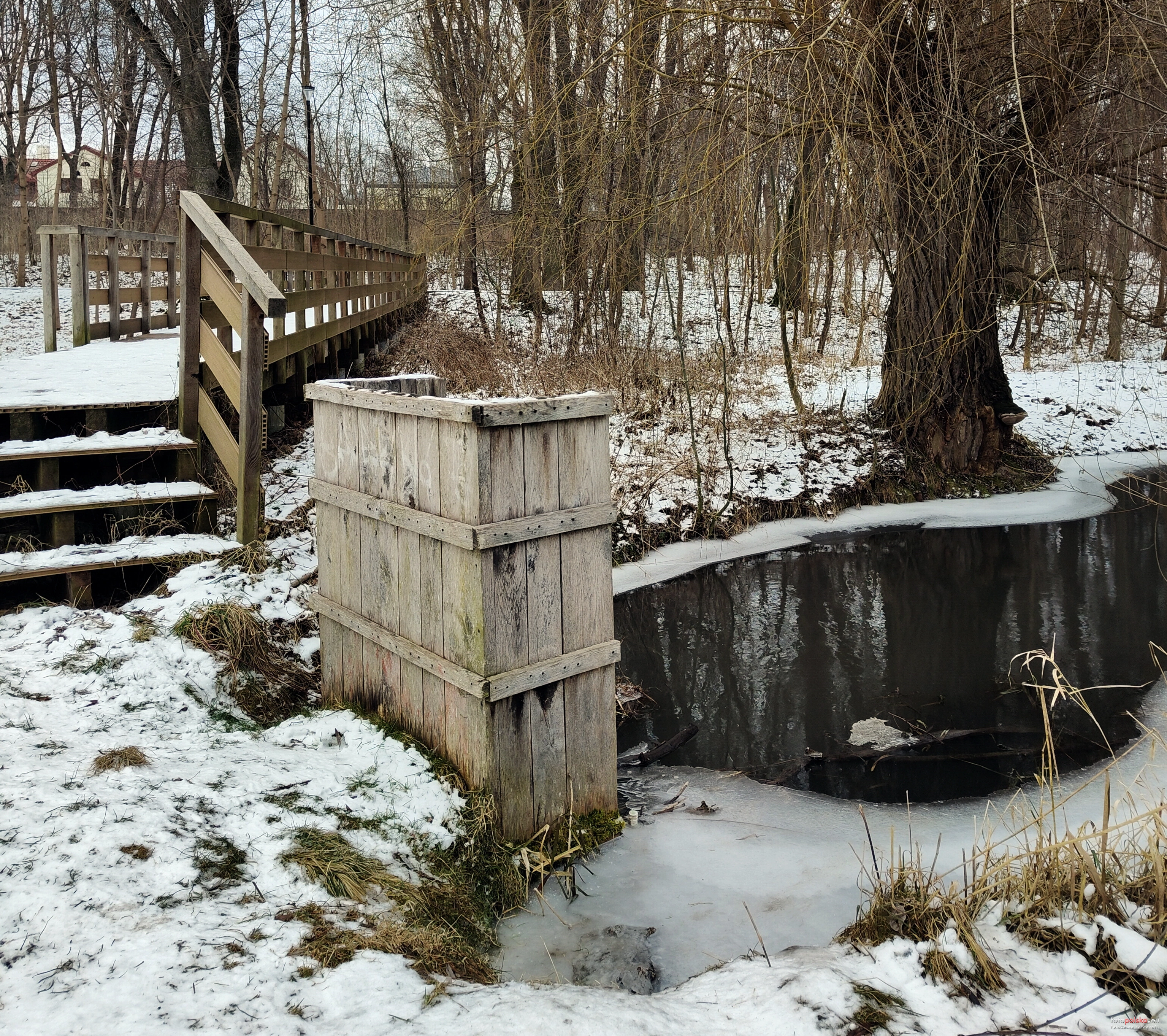 19 lutego 2025 , Drewniany mnich spustowy przy stawie nr 1 i kładce 1 (z lewej).Skomentuj zdjęcie |