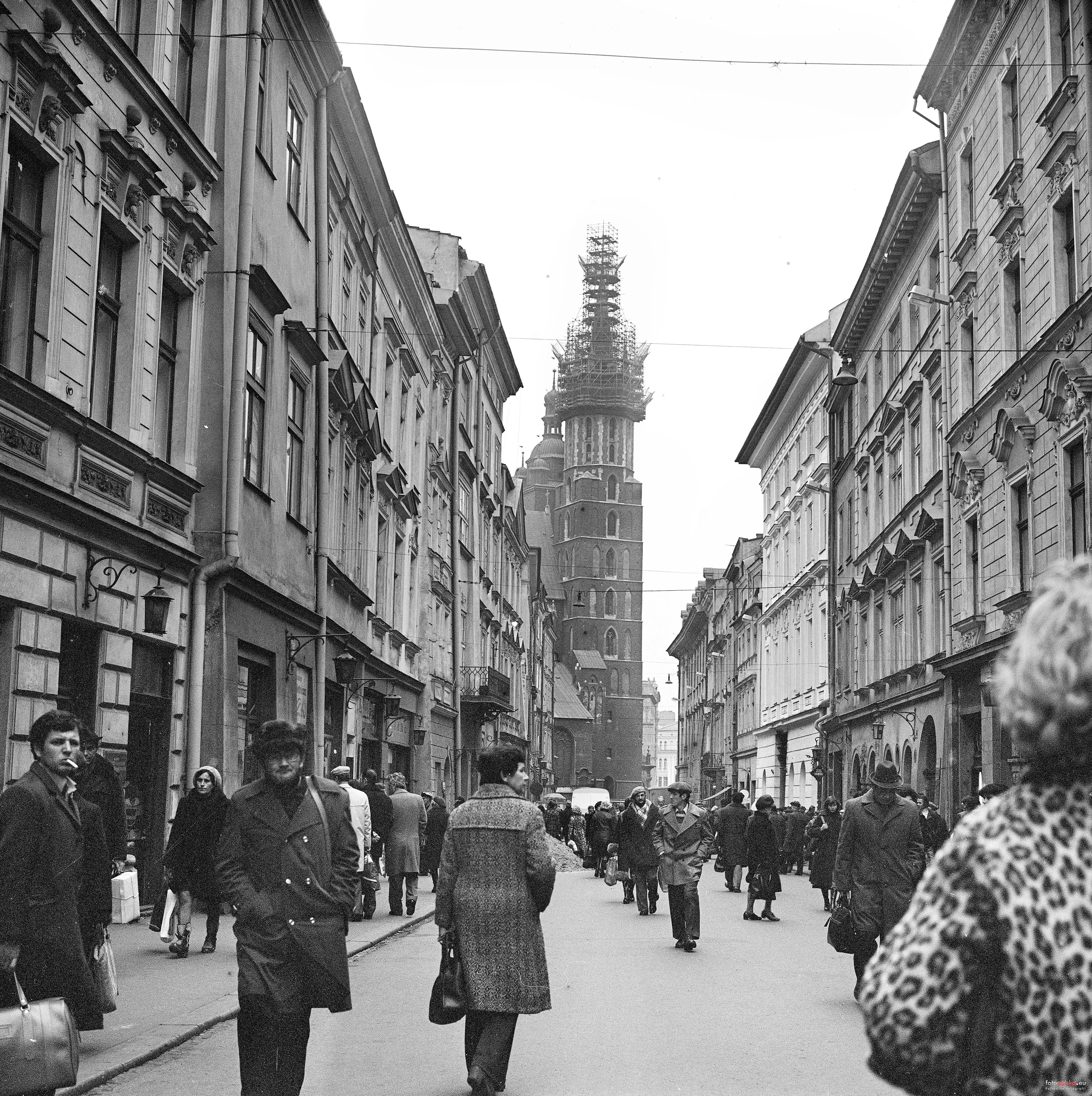23 listopada 1978 , Fragment zabudowy ulicy Floriańskiej, do zbiegu z Rynkiem Głównym. Wieża Kościoła Mariackiego w trakcie remontu.Skomentuj zdjęcie |