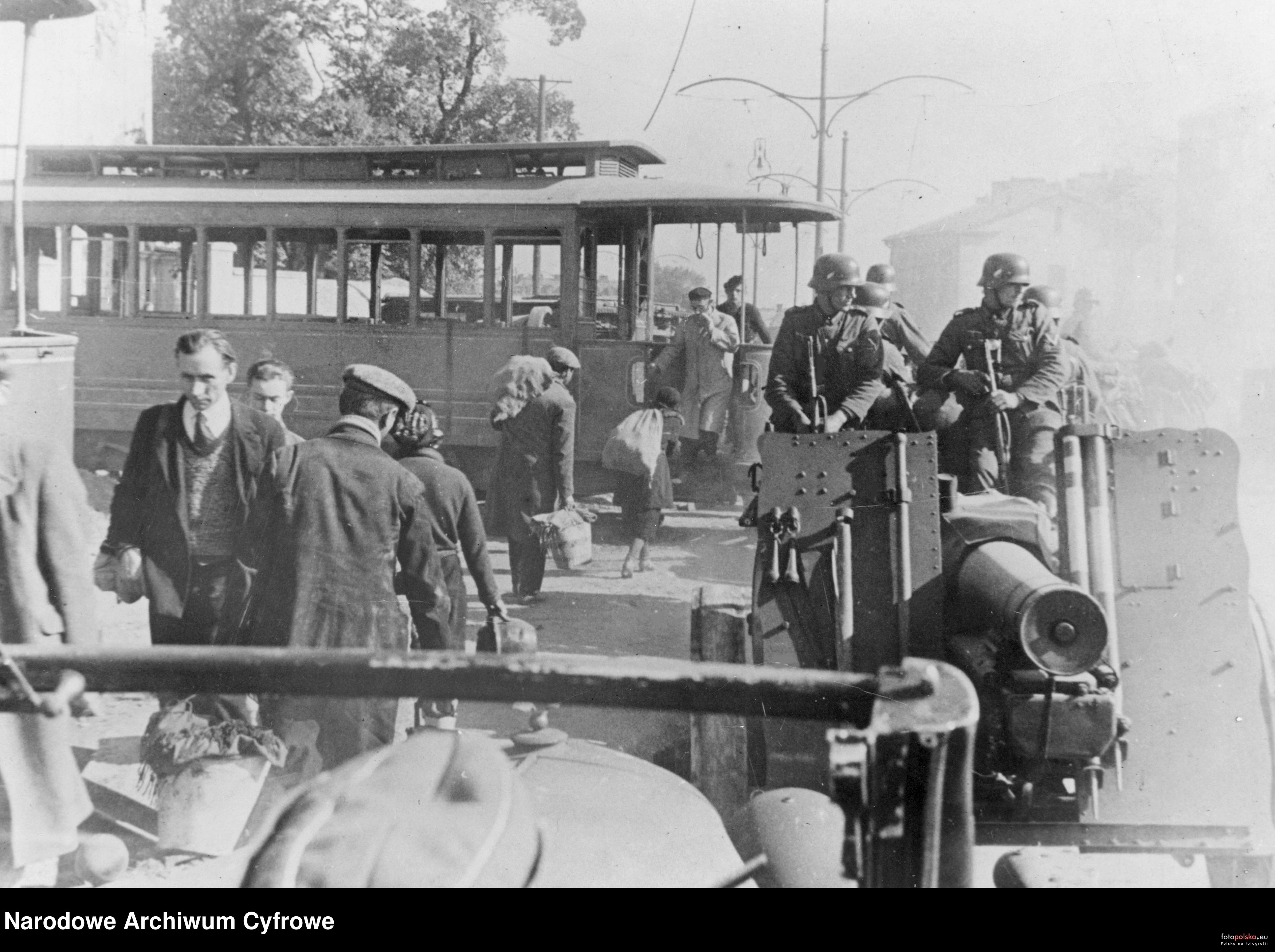 październik 1939 , Oddział artylerii niemieckiej z działem sIG 33 kal. 150 mm mija barykadę zbudowaną z tramwaju (wóz doczepny P-9) na ul. Wolskiej na wysokości kościoła św. WawrzyńcaSkomentuj zdjęcie |